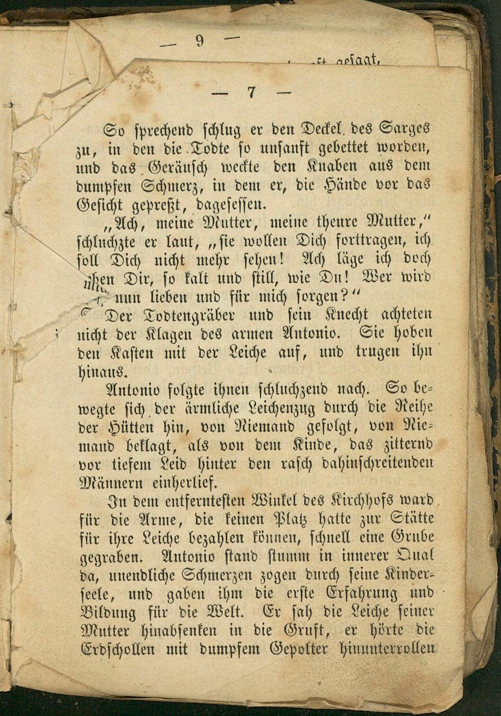 In dem entfernteſten Winkel des Kirchhofs ward für die Arme, die keinen Platz hatte zur Stätte für ihre Leiche bezahlen können, ſchnell eine Grube gegraben. Antonio ſtand ſtumm in innerer Qual da, unendliche Schmerzen zogen durch ſeine Kinder⸗ ſeele, und gaben ihm die erſte Erfahrung und Bildung für die Welt. Er ſah die Leiche ſeiner Mutter hinabſenken in die Gruft, er hörte die Erdſchollen mit dumpfem Gepolter hinunterrollen