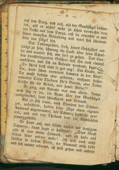ter und wandt„ um fort zu gehen. Des Kna⸗ ben durchdringendes Geſchrei lie ihn noch einmal umkehren, und ſich an Antonio wendend, ſagte. 4 „So ſchrei doch nicht ſo gar arg! Ein Knabe, wir u, wird vorwärts kommen in der Welt! u mußt betteln oder arbeiten, ve ſpare daher entweder Deine Thränen für's Betteln 1 räfte für die Arbei 3