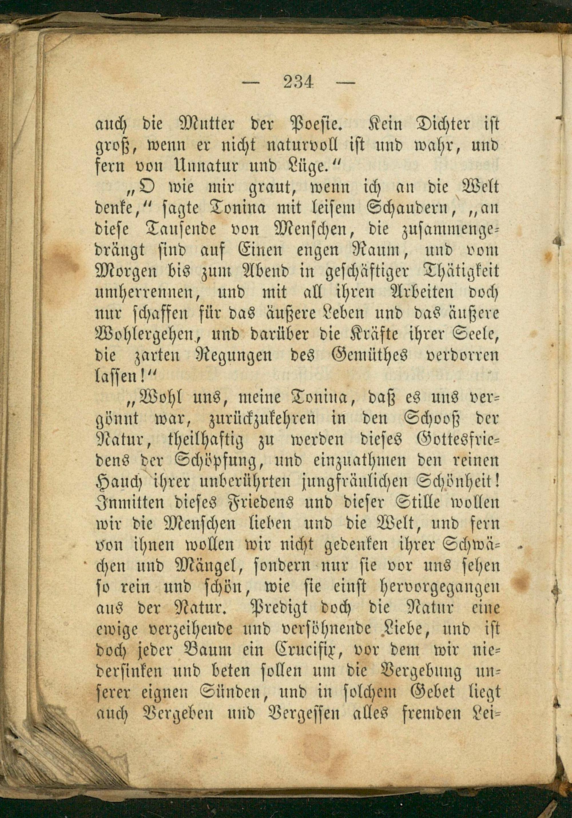 „Wohl uns, meine Tonina, daß es uns ver⸗ gönnt war, zurückzukehren in den Schooß der Natur, theilhaftig zu werden dieſes Gottesfrie⸗ dens der Schöpfung, und einzuathmen den reinen Hauch ihrer unberührten jungfräulichen Schönheit! Inmitten dieſes Friedens und dieſer Stille wollen wir die Menſchen lieben und die Welt, und fern von ihnen wollen wir nicht gedenken ihrer Schwä⸗ chen und Mängel, ſondern nur ſie vor uns ſehen ſo rein und ſchön, wie ſie einſt hervorgegangen aus der Natur. Predigt doch die Natur eine ewige verzeihende und verſöhnende Liebe, und iſt doch jeder Baum ein Crucifix, vor dem wir nie⸗ derſinken und beten ſollen um die Vergebung un⸗ ſerer eignen Sünden, und in ſolchem Gebet liegt aauch Vergeben und Vergeſſen alles fremden Lei⸗