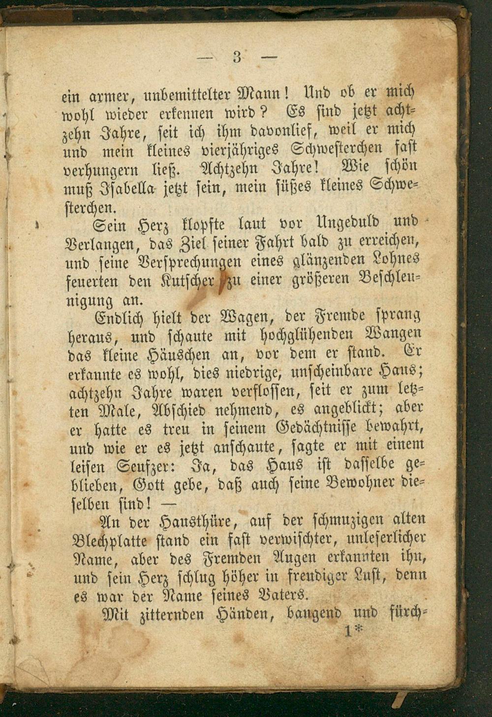 Endlich hielt der Wagen, der Fremde ſprang heraus, und ſchaute mit hochglühenden Wangen das kleine Häuschen an, vor dem er ſtand. Er erkannte es wohl, dies niedrige, unſcheinbare Haus; achtzehn Jahre waren verfloſſen, ſeit er zum letz⸗ ten Male, Abſchied nehmend, es angeblickt; aber er hatte es treu in ſeinem Gedächtniſſe bewahrt, und wie er es jetzt anſchaute, ſagte er mit einem