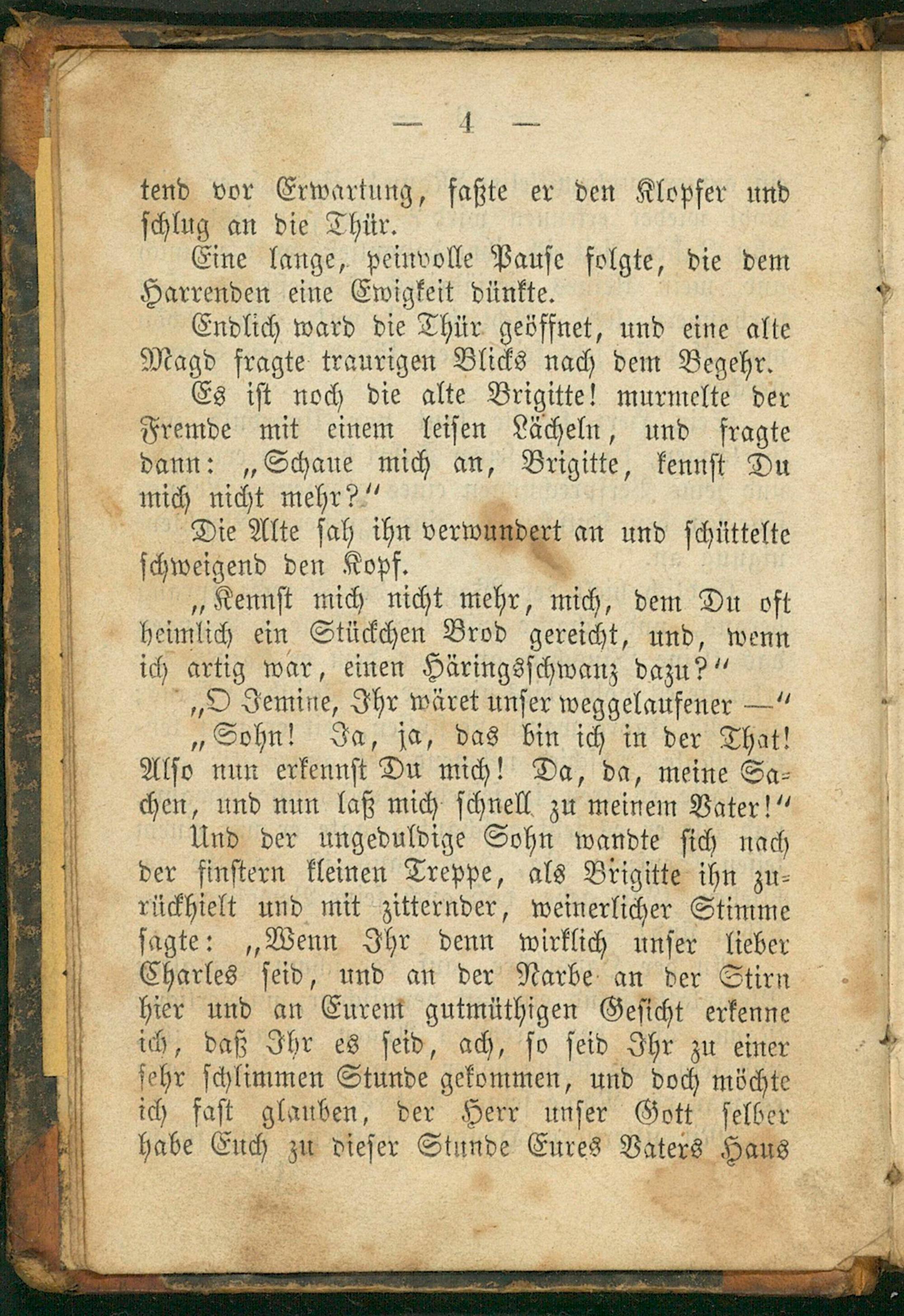 Und der ungeduldige Sohn wandte ſich nach der finſtern kleinen Treppe, als Brigitte ihn zu⸗ rückhielt und mit zitternder, weinerlicher Stimme ſagte:„Wenn Ihr denn wirklich unſer lieber Charles ſeid, und an der Narbe an der Stirn hier und an Eurem gutmüthigen Geſicht erkenne ich, daß Ihr es ſeid, ach, ſo ſeid Ihr zu einer ſehr ſchlimmen Stunde gekommen, und doch möchte ich faſt glauben, der Herr unſer Gott ſelber