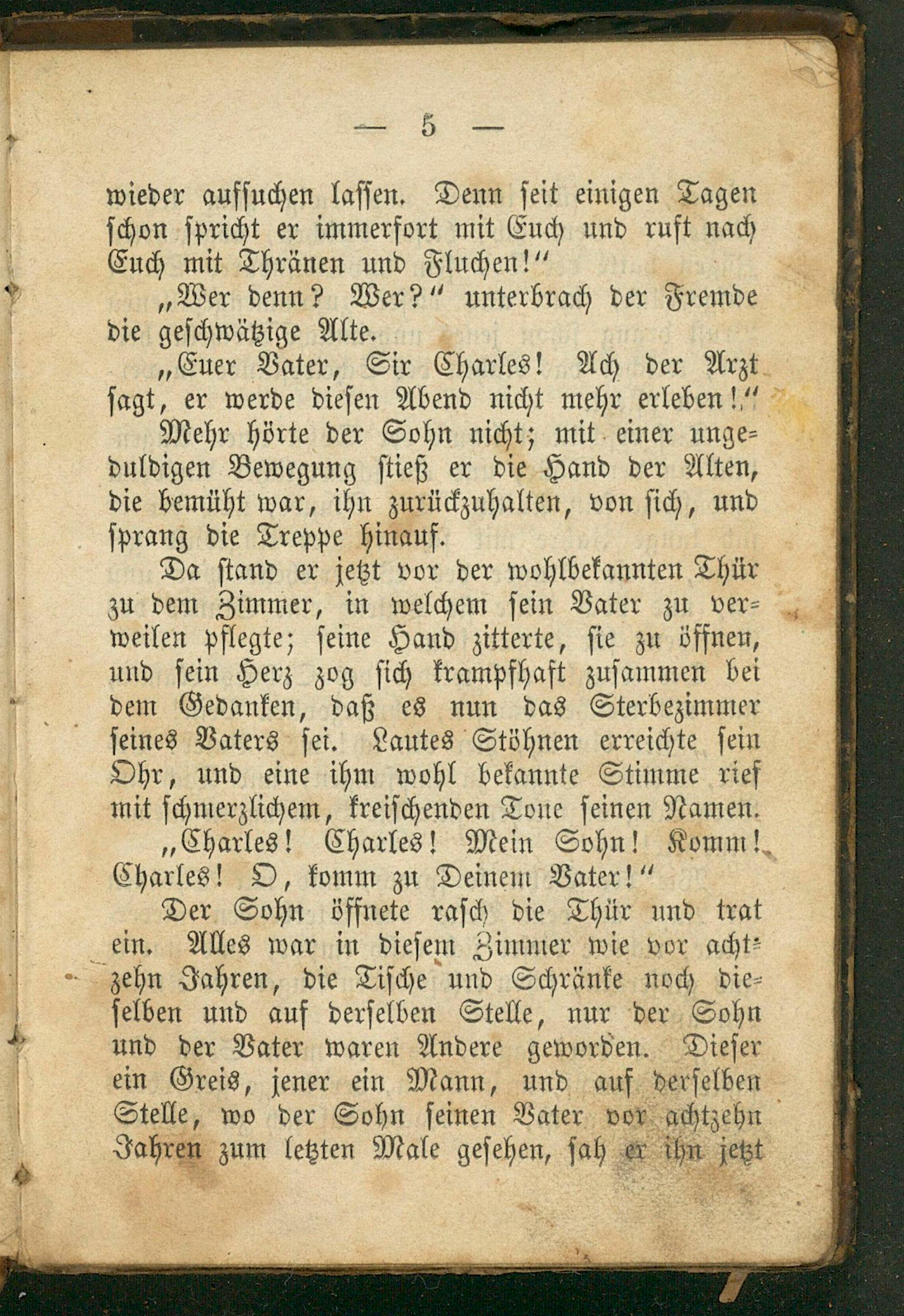 Da ſtand er jetzt vor der wohlbekannten Thür zu dem Zimmer, in welchem ſein Vater zu ver⸗ weilen pflegte; ſeine Hand zitterte, ſie zu öffnen, und ſein Herz zog ſich krampfhaft zuſammen bei dem Gedanken, daß es nun das Sterbezimmer ſeines Vaters ſei. Lautes Stöhnen erreichte ſein Ohr, und eine ihm wohl bekannte Stimme rief mit ſchmerzlichem, kreiſchenden Tone ſeinen Namen.