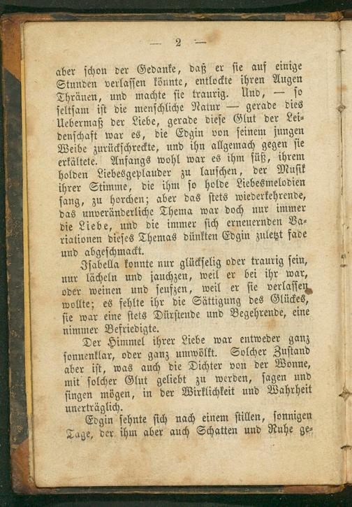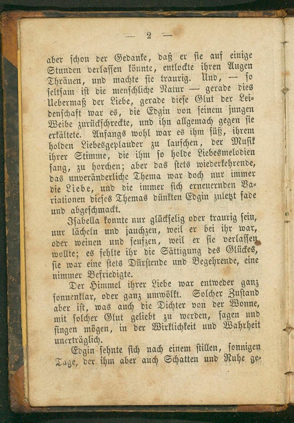 aber ſchon der Gedanke, daß er ſie auf einige Stunden verlaſſen könnte, entlockte ihren Augen Thränen, und machte ſie traurig. Und,— ſo ſeltſam iſt die menſchliche Natur— gerade dies Uebermaß der Liebe, gerade dieſe Glut der Lei⸗ denſchaft war es, die Edgin von ſeinem jungen Weibe zurückſchreckte, und ihn allgemach gegen ſie erkältete. Anfangs wohl war es ihm ſüß, ihrem holden Liebesgeplauder zu lauſchen, der Muſik ihrer Stimme, die ihm ſo holde Liebesmelodien ſang, zu horchen; aber das ſtets wiederkehrende, das unveränderliche Thema war doch nur immer die Liebe, und die immer ſich erneuernden Va⸗ riationen dieſes Themas dünkten Edgin zuletzt fade und abgeſchmackt.