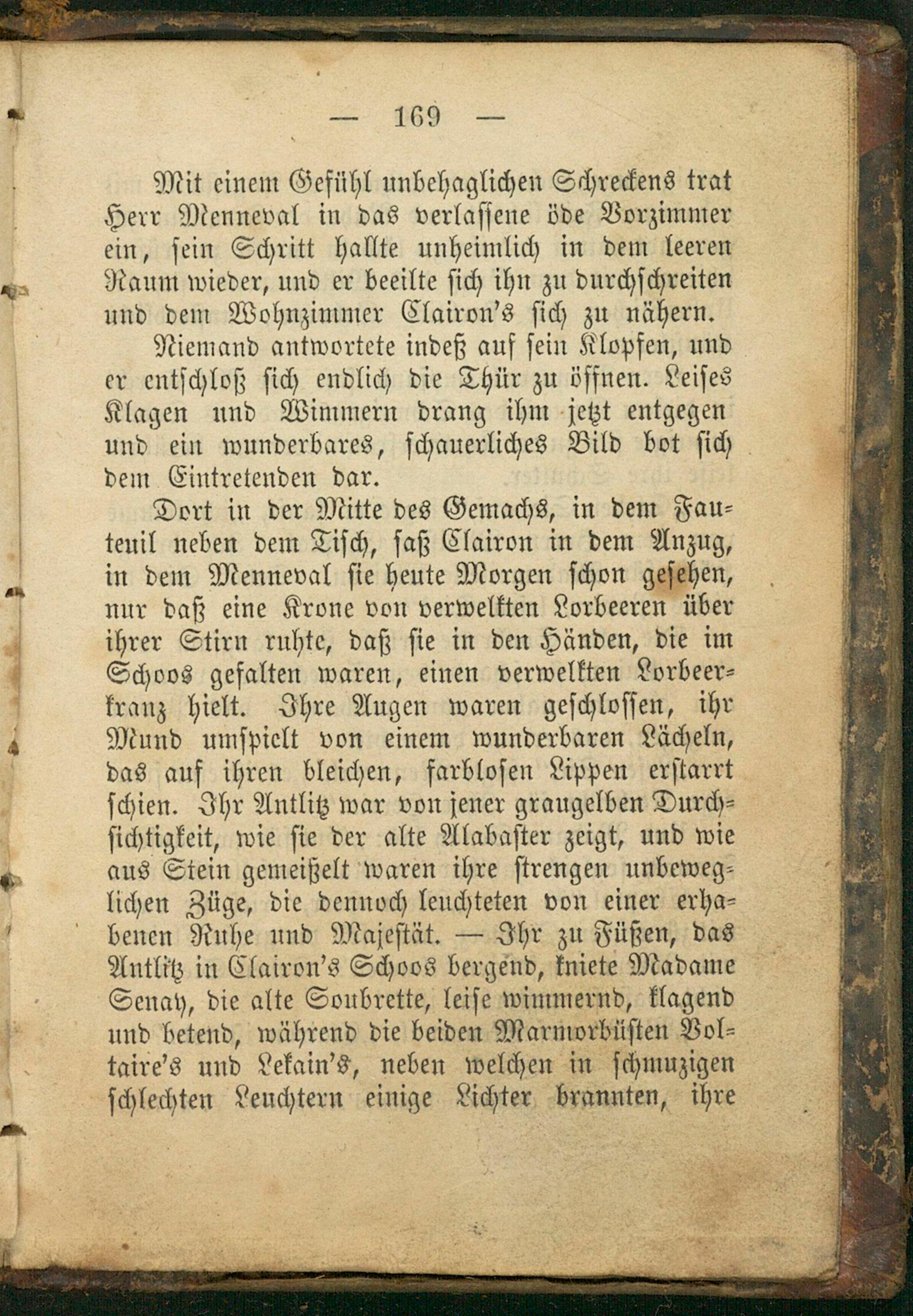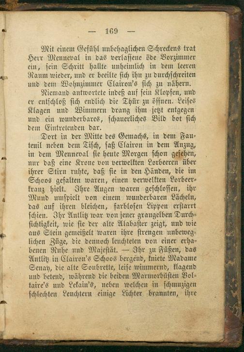 Mit einem Gefühl unbehaglichen Schreckens trat Herr Menneval in das verlaſſene öde Vorzimmer ein, ſein Schritt hallte unheimlich in dem leeren Raum wieder, und er beeilte ſich ihn zu durchſchreiten und dem Wohnzimmer Clairon's ſich zu nähern.