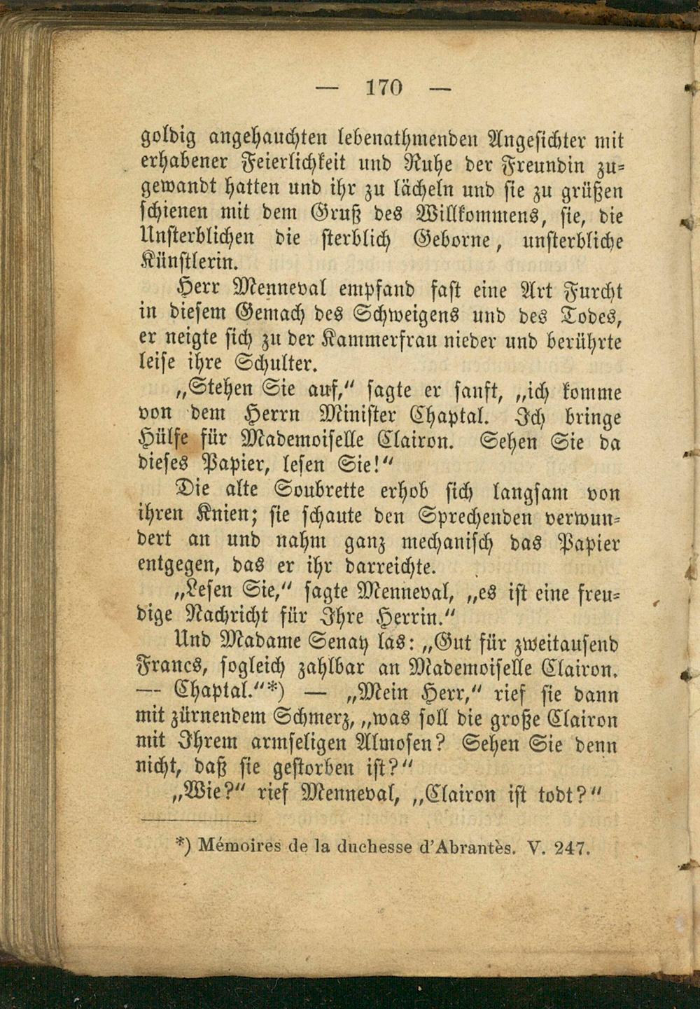 Und Madame Senay las:„Gut für zweitauſend Francs, ſogleich zahlbar an Mademoiſelle Clairon. — Chaptal.“*)—„Mein Herr,“ rief ſie dann mit zürnendem Schmerz,„was ſoll die große Clairon mit Ihrem armſeligen Almoſen? Sehen Sie denn nicht, daß ſie geſtorben iſt?“