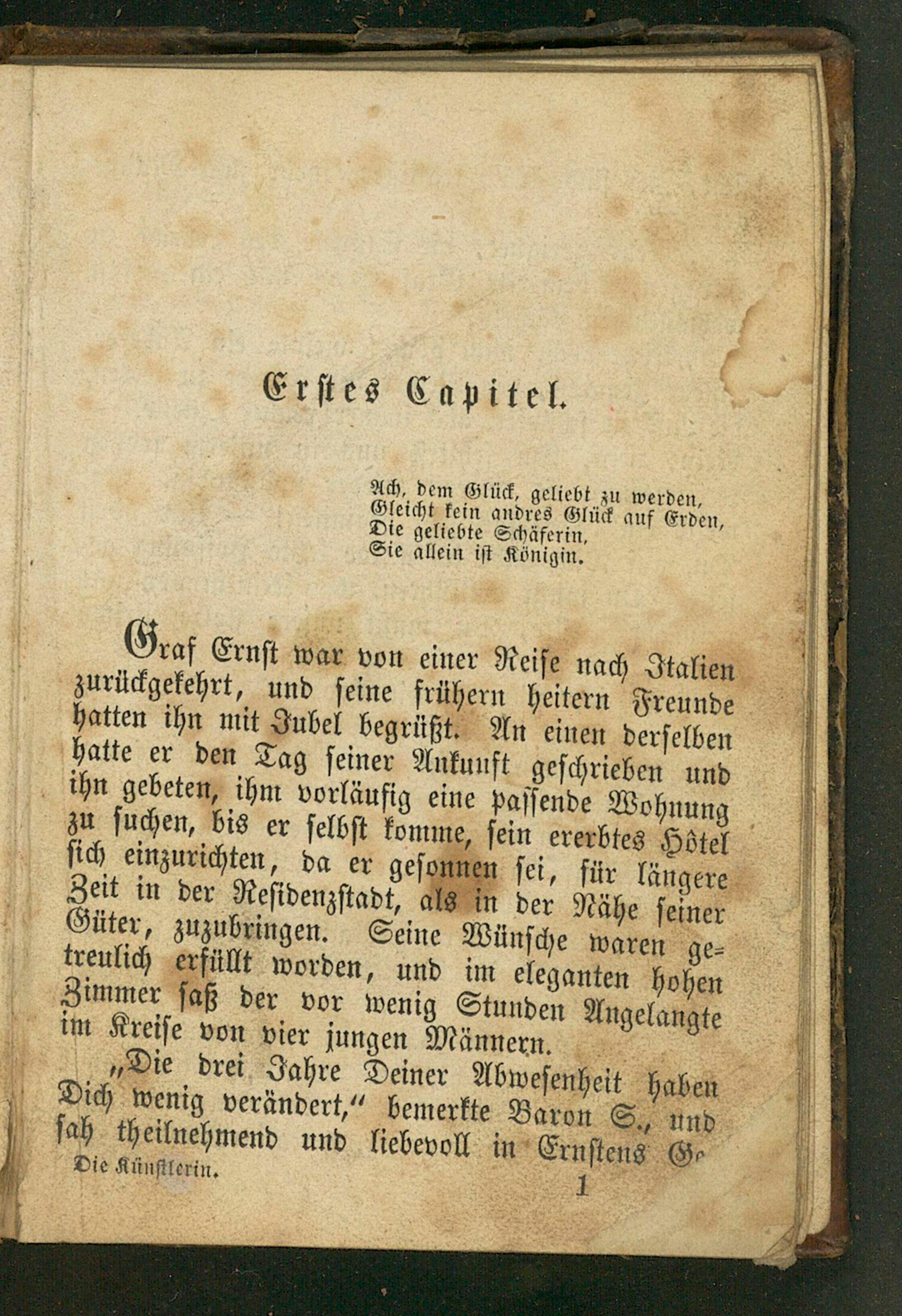 Graf Ernſt war von einer Reiſe nach Italien zurückgekehrt, und ſeine frühern heitern Freunde hatten ihn mit Jubel begrüßt. An einen derſelben hatte er den Tag ſeiner Ankunft geſchrieben und