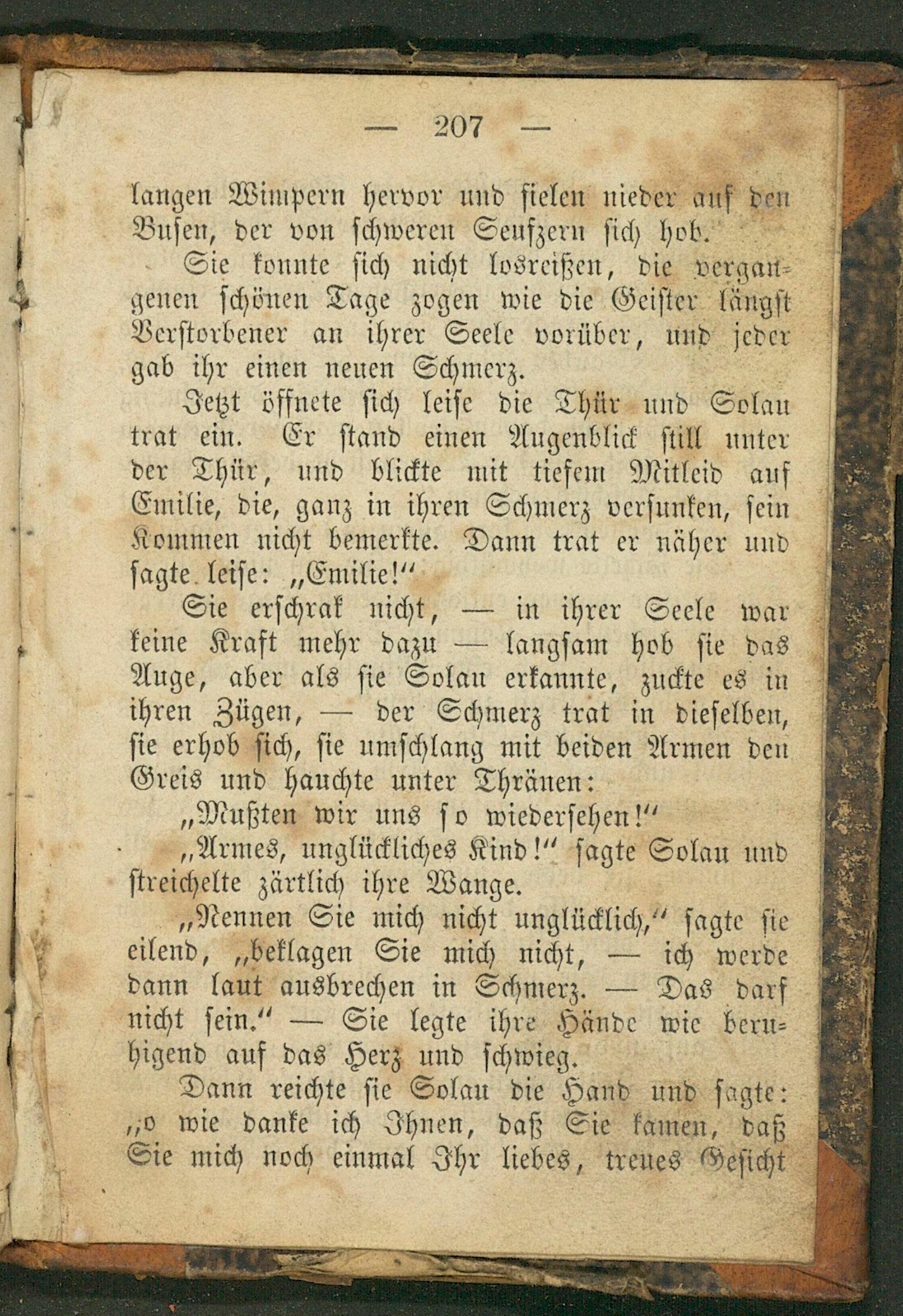 Jetzt öffnete ſich leiſe die Thür und Solau trat ein. Er ſtand einen Augenblick ſtill unter der Thür, und blickte mit tiefem Mitleid auf Emilie, die, ganz in ihren Schmerz verſunken, ſein Kommen nicht bemerkte. Dann trat er näher und ſagte leiſe:„Emilie!“