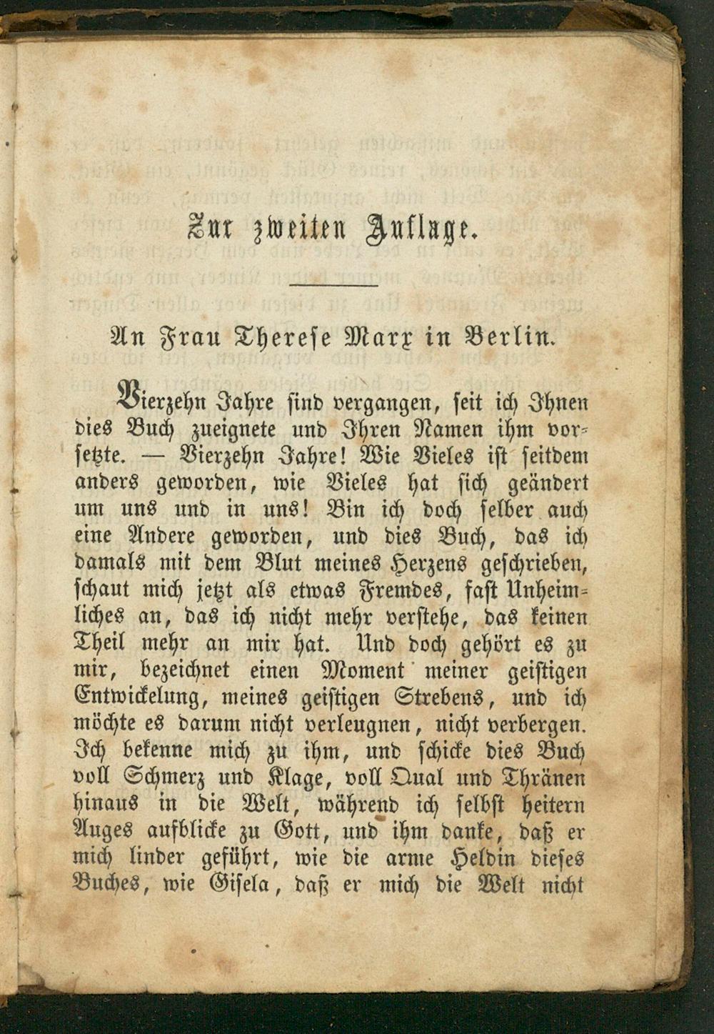 Vierzehn Jahre ſind vergangen, ſeit ich Ihnen dies Buch zueignete und Ihren Namen ihm vor⸗ ſetzte.— Vierzehn Jahre! Wie Vieles iſt ſeitdem anders geworden, wie Vieles hat ſich geändert um uns und in uns! Bin ich doch ſelber auch eine Andere geworden, und dies Buch, das ich damals mit dem Blut meines Herzens geſchrieben, ſchaut mich jetzt als etwas Fremdes, faſt Unheim⸗ liches an, das ich nicht mehr verſtehe, das keinen Theil mehr an mir hat. Und doch gehört es zu mir, bezeichnet einen Moment meiner geiſtigen Entwickelung, meines geiſtigen Strebens, und ich möchte es darum nicht verleugnen, nicht verbergen. Ich bekenne mich zu ihm, und ſchicke dies Buch