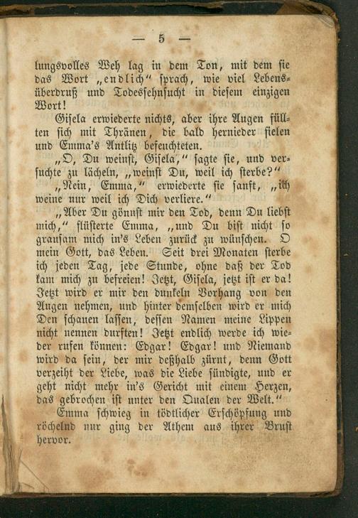 lungsvolles Weh lag in dem Ton, mit dem ſie das Wort„endlich“ ſprach, wie viel Lebens⸗ überdruß und Todesſehnſucht in dieſem einzigen Wort! 8 Giſela erwiederte nichts, aber ihre Augen füll⸗ ten ſich mit Thränen, die bald hernieder ſielen und Emma's Antlitz befeuchteten. „O, Du weinſt, Giſela,“ ſagte ſie, und ver⸗ ſuchte zu lächeln,„weinſt Du, weil ich ſterbe?“ „Nein, Emma,“ erwiederte ſie ſanft,„ich weine nur weil ich Dich verliere.“. „Aber Du gönnſt mir den Tod, denn Du liebſt mich,“ flüſterte Emma,„und Du biſt nicht ſo grauſam mich in's Leben zurück zu wünſchen. O mein Gott, das Leben. Seit drei Monaten ſterbe ich jeden Tag, jede Stunde, ohne daß der Tod kam mich zu befreien! Jetzt, Giſela, jetzt iſt er da! Jetzt wird er mir den dunkeln Vorhang von den Augen nehmen, und hinter demſelben wird er mich Den ſchauen laſſen, deſſen Namen meine Lippen nicht nennen durften! Zetzt endlich werde ich wie⸗ der rufen können: Edgar! Edgar! und Niemand wird da ſein, der mir deßhalb zürnt, denn Gott verzeiht der Liebe, was die Liebe ſündigte, und er geht nicht mehr in's Gericht mit einem Herzen, das gebrochen iſt unter den Qualen der Welt.“ Emma ſchwieg in tödtlicher Erſchöpfung und röchelnd nur ging der Athen aus hie hervor.