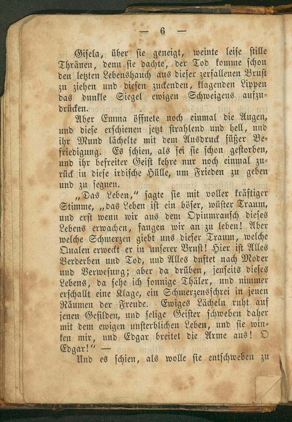 „Das Leben,“ ſagte ſie mit voller kräftiger Stimme,„das Leben iſt ein böſer, wüſter Traum, und erſt wenn wir aus dem Opinmrauſch dieſes Lebens erwachen, fangen wir an zu leben! Aber welche Schmerzen giebt uns dieſer Traum, welche Qualen erweckt er in unſerer Bruſt! Hier iſt Alles Verderben und Tod, und Alles duftet nach Moder und Verweſung; aber da drüben, jenſeits dieſes Lebens, da ſehe ich ſonnige Thäler, und nimmer erſchallt eine Klage, ein Schmerzensſchrei in jenen Räumen der Freude. Ewiges Lächeln ruht auf jenen Gefilden, und ſelige Geiſter ſchweben daher mit dem ewigen unſterblichen Leben, und ſie win⸗