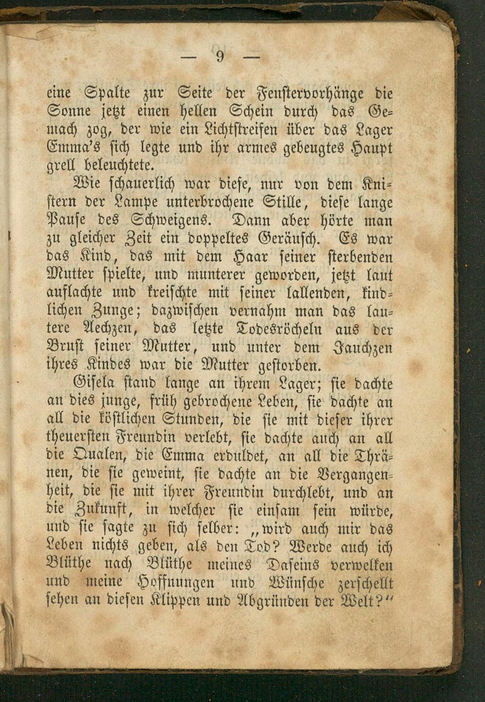 eine Spalte zur Seite der Fenſtervorhänge die Sonne jetzt einen hellen Schein durch das Ge⸗ mach zog, der wie ein Lichtſtreifen über das Lager Emma's ſich legte und ihr armes gebeugtes Haupt grell beleuchtete.