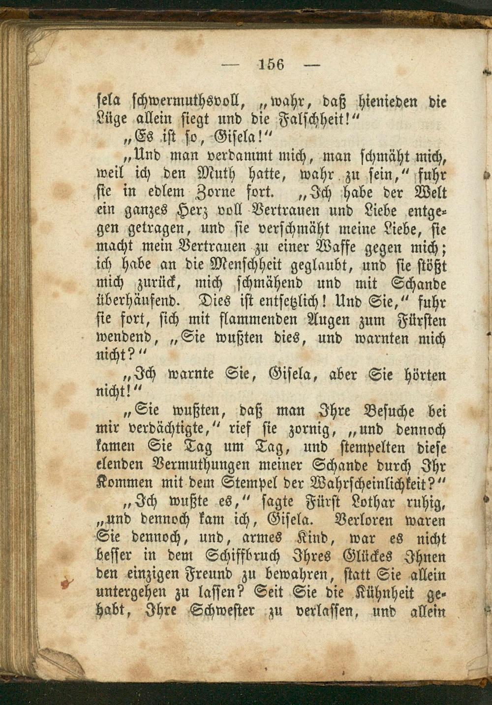 ſela ſchwermuthsvoll,„wahr, daß hienieden die Lüge allein ſiegt und die Falſchheit!“ „Es iſt ſo, Giſela!“ „Und man verdammt mich, man ſchmäht mich, weil ich den Muth hatte, wahr zu ſein,“ fuhr 5 ſie in edlem Zorne fort.„Ich habe der Welt ein ganzes Herz voll Vertrauen und Liebe entge⸗ gen getragen, und ſie verſchmäht meine Liebe, ſie macht mein Vertrauen zu einer Waffe gegen mich; ich habe an die Menſchheit geglaubt, und ſie ſtößt mich zurück, mich ſchmähend und mit Schande überhäufend. Dies iſt entſetzlich! Und Sie,“ fuhr ſie fort, ſich mit flammenden Augen zum Fürſten wendend,„Sie wußten dies, und warnten mich nicht?“ „Ich warnte Sie, Giſela, aber Sie hörten nicht!“ „Sie wußten, daß man Ihre Beſuche bei mir verdächtigte,“ rief ſie zornig,„und dennoch kamen Sie Tag um Tag, und ſtempelten dieſe elenden Vermuthungen meiner Schande durch Ihr. Kommen mit dem Stempel der Wahrſcheinlichkeit?“ „Ich wußte es,“ ſagte Fürſt Lothar ruhig, „und dennoch kam ich, Giſela. Verloren waren Sie dennoch, und, armes Kind, war es nicht beſſer in dem Schiffbruch Ihres Glückes Ihnen 5 den einzigen Freund zu bewahren, ſtatt Sie allein untergehen zu laſſen? Seit Sie die Kühnheit ge⸗ habt, Ihre Schweſter zu verlaſſen, und allein