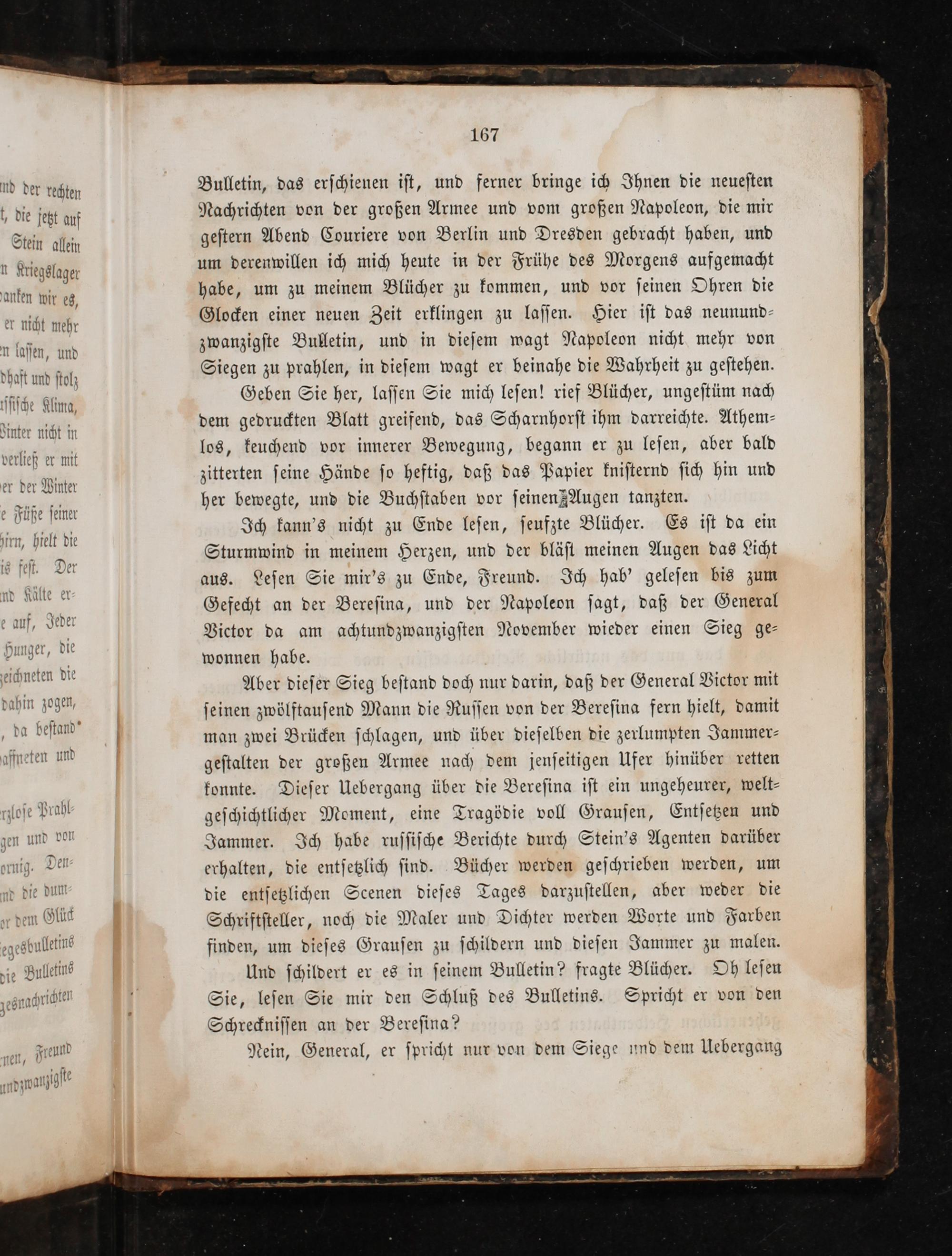 Bulletin, das erſchienen iſt, und ferner bringe ich Ihnen die neueſten Nachrichten von der großen Armee und vom großen Napoleon, die mir geſtern Abend Couriere von Berlin und Dresden gebracht haben, und um derenwillen ich mich heute in der Frühe des Morgens aufgemacht habe, um zu meinem Blücher zu kommen, und vor ſeinen Ohren die Glocken einer neuen Zeit erklingen zu laſſen. Hier iſt das neunund⸗ zwanzigſte Bulletin, und in dieſem wagt Napoleon nicht mehr von Siegen zu prahlen, in dieſem wagt er beinahe die Wahrheit zu geſtehen.