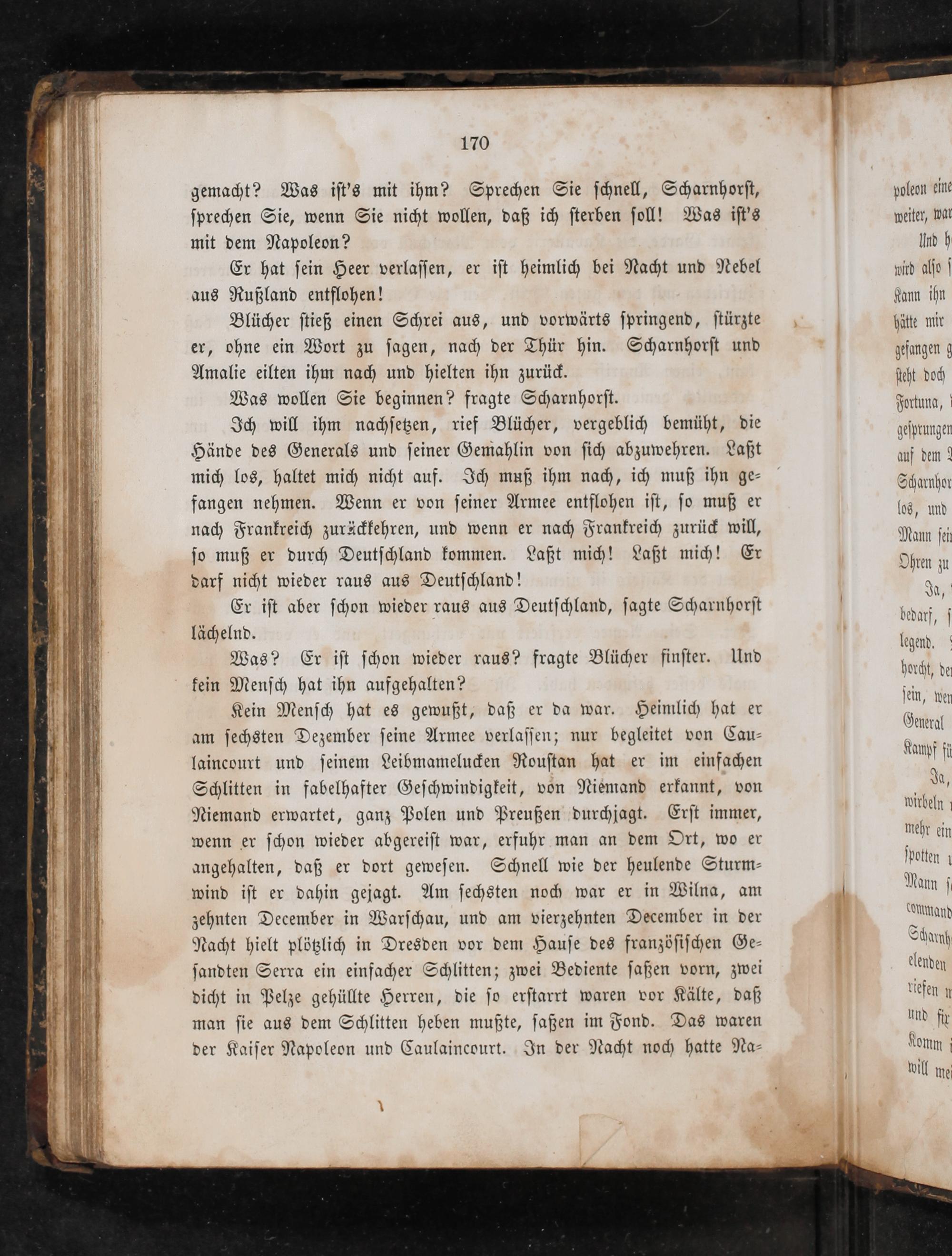 Kein Menſch hat es gewußt, daß er da war. Heimlich hat er am ſechsten Dezember ſeine Armee verlaſſen; nur begleitet von Cau⸗ laincourt und ſeinem Leibmamelucken Rouſtan hat er im einfachen Schlitten in fabelhafter Geſchwindigkeit, von Niemand erkannt, von Niemand erwartet, ganz Polen und Preußen durchjagt. Erſt immer, wenn er ſchon wieder abgereiſt war, erfuhr man an dem Ort, wo er angehalten, daß er dort geweſen. Schnell wie der heulende Sturm⸗ wind iſt er dahin gejagt. Am ſechsten noch war er in Wilna, am zehnten December in Warſchau, und am vierzehnten December in der Nacht hielt plötzlich in Dresden vor dem Hauſe des franzöſiſchen Ge⸗ ſandten Serra ein einfacher Schlitten; zwei Bediente ſaßen vorn, zwei dicht in Pelze gehüllte Herren, die ſo erſtarrt waren vor Kälte, daß man ſie aus dem Schlitten heben mußte, ſaßen im Fond. Das waren der Kaiſer Napoleon und Caulaincourt. In der Nacht noch hatte Na⸗