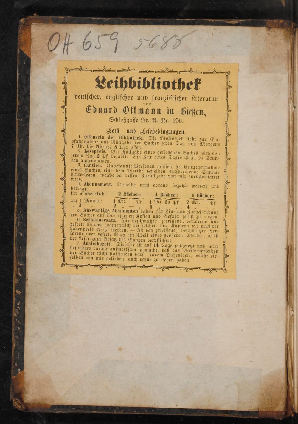 Seih und Keſebedingungen 1. Offensein der Bibliothek. Die Bibliothek ſteht zur Em pfangnahme und Rückgabe der Bücher jeden Tag von Morgene 7 Uhr bis Abends 8 Uhr offen. 2. Lesepreis. Bei Rückgabe eines geliehenen Buches wird von jedem Tag 5 Pf bezahlt. Die Zeit eines Tages iſt zu 24 Stun⸗ den angenommen. 3. Caution. Unbekannte Perſonen müſſen, bei Entgegennahme eines Buches, eine dem Werthe deſſelben entſprechende Summe binterlegen, welche bei veſſen Zurückgabe von mir zurückerſtattet wird. 4. Abonnement. Daſſelbe muß voraus bezahlt werden und beträgt: