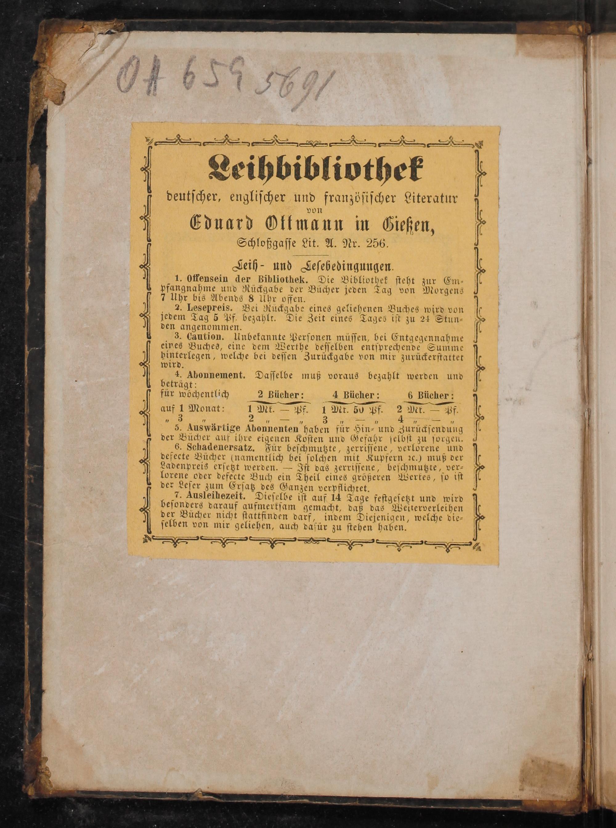 7. Ausleihezeit. Dieſelbe iſt auf 14 Tage feſtgeſetzt und wird beſonders varauf aufmertſam gemacht, daß das Weiterverleihen der Bücher nicht ſtattfinden darf, indem Diejenigen, welche die⸗ ſelben von mir geliehen, auch dafür zu ſtehen haben.