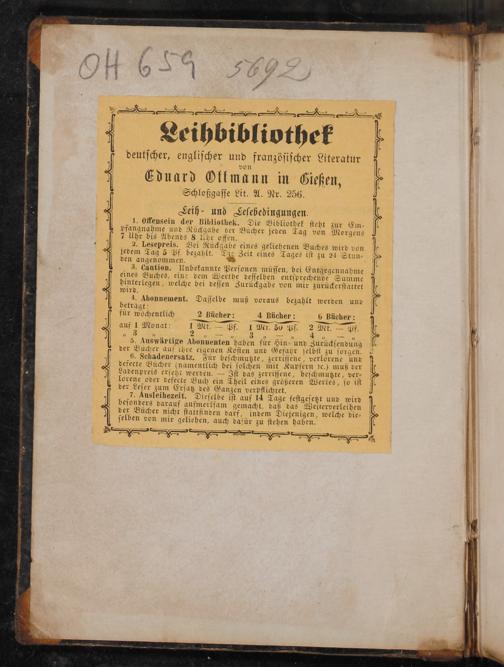 „ 5 Auswärtige Abonnenten haben für Hin und Zurückſendung der Bücher auf ihre eigenen Koſten und Gefahr ſelbſt zu ſorgen. 3 6. Schadenersatz. Für beſchmutzte, zerriſſene, verlorene und defecte Bücher(namentlich bei olchen mit Kupfern ꝛc.) muß der Ladenpreis erſetzt werden.— Iſt das zerriſſene, beſchmutzte, ver⸗ lorene oder vefecte Buch ein Theil eines größeren Werkes, ſo iſt