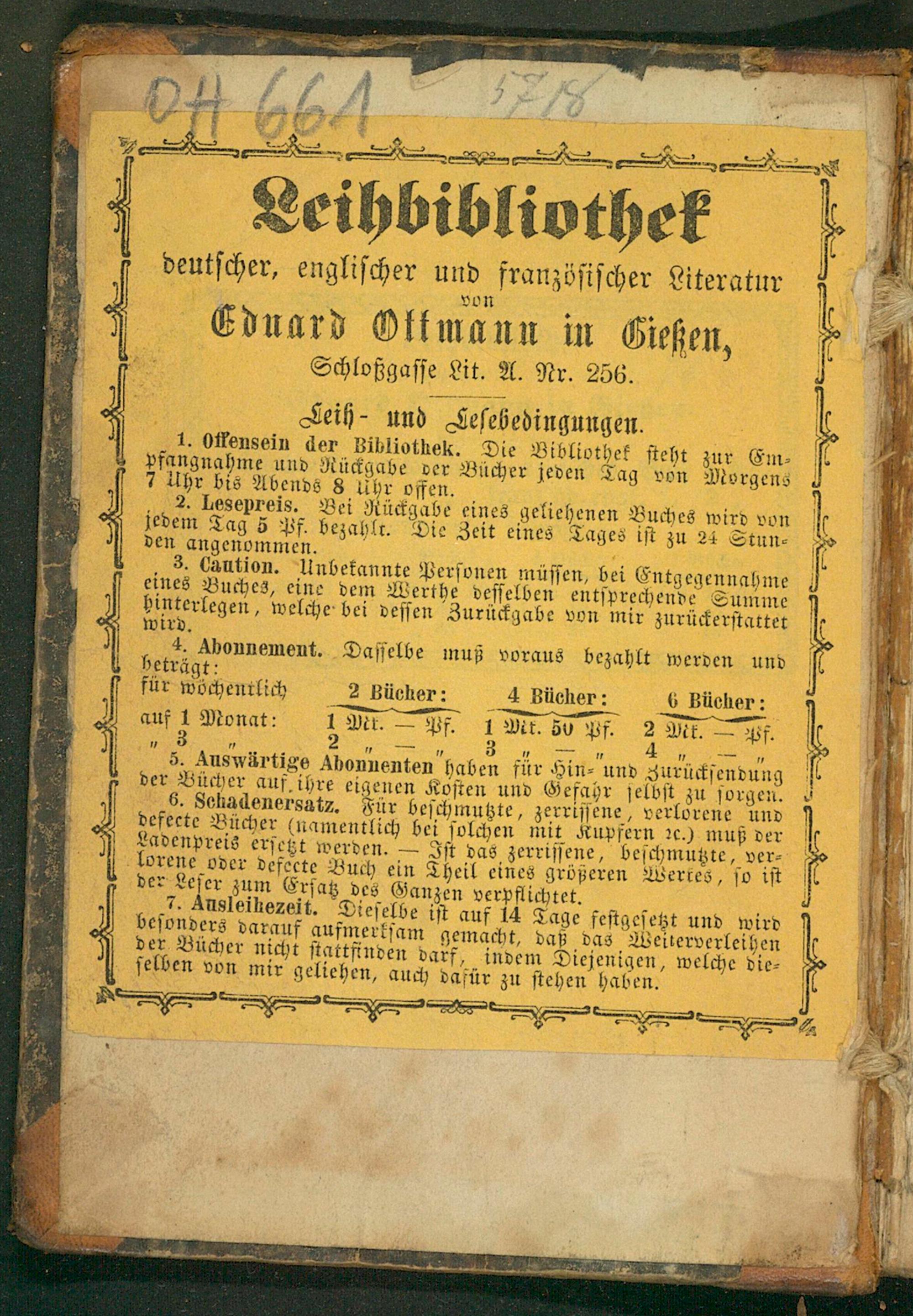 6. Schadenersatz. Für beſchmutzte, zerriſſene, verlorene und defecte Bücher(namentlich bei ſolchen mit Kupfern ꝛc.) muß der Ladenpreis erſetzt werden.— Iſt das zerriſſene, beſchmutzte, ver⸗ lorene oder defeete Buch ein Theil eines größeren Wertes, ſo iſt der et zum Erſat des Ganzen verpflichtet.