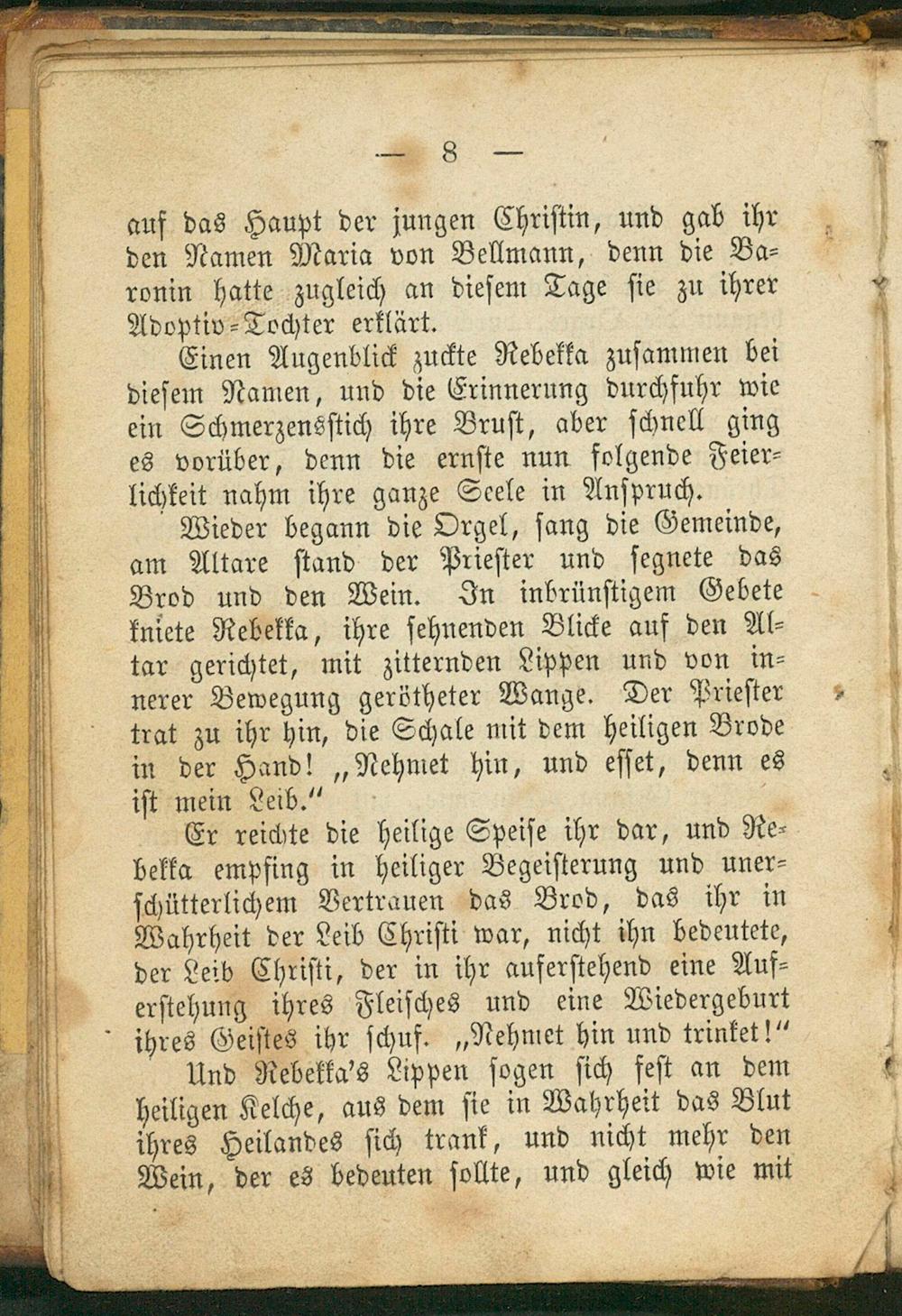 kniete Rebekka, ihre ſehnenden Blicke auf den Al⸗ tar gerichtet, mit zitternden Lippen und von in⸗ nerer Bewegung gerötheter Wange. Der Prieſter trat zu ihr hin, die Schale mit dem heiligen Brode in der Hand!„Nehmet hin, und eſſet, denn es iſtmein eib Er reichte die heilige Speiſe ihr dar, und Re⸗ bekka empfing in heiliger Begeiſterung und uner⸗ ſchütterlichem Vertrauen das Brod, das ihr in Wahrheit der Leib Chriſti war, nicht ihn bedeutete, der Leib Chriſti, der in ihr auferſtehend eine Auf⸗ erſtehung ihres Fleiſches und eine Wiedergeburt ihres Geiſtes ihr ſchuf.„Nehmet hin und trinket!“ Und Rebekka's Lippen ſogen ſich feſt an dem heiligen Kelche, aus dem ſie in Wahrheit das Blut ihres Heilandes ſich trank, und nicht mehr den Wein, der es bedeuten ſollte, und gleich wie mit
