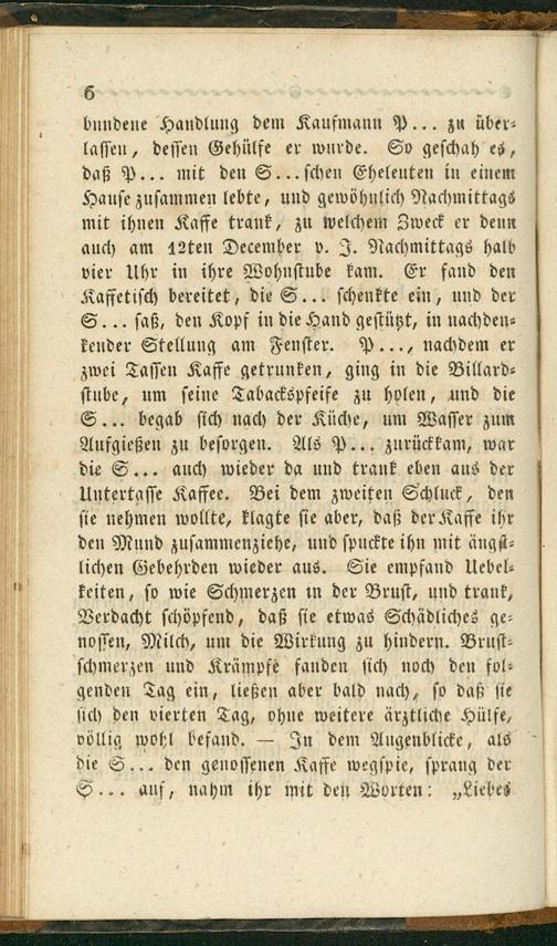 bundene Handlung dem Kaufmann P... zu über⸗ laſſen, deſſen Gehülfe er wurde. So geſchah es, daß P... mit den S.. ſchen Eheleuten in einem Hauſe zuſammen lebte, und gewöhnlich Nachmittags mit ihnen Kaffe trank, zu welchem Zweck er denn auch am 12ten December v. J. Nachmittags halb vier Uhr in ihre Wohnſtube kam. Er fand den Kaffetiſch bereitet, die S... ſchenkte ein, und der S.. ſaß, den Kopf in die Hand geſtützt, in nachden⸗ kender Stellung am Fenſter. P...., nachdem er zwei Taſſen Kaffe getrunken, ging in die Billard⸗ ſtube, um ſeine Tabackspfeife zu holen, und die S.. begab ſich nach der Küche, um Waſſer zum Aufgießen zu beſorgen. Als P.. zurückkam, war die S.. auch wieder da und trank eben aus der Untertaſſe Kaffee. Bei dem zweiten Schluck, den ſie nehmen wollte, klagte ſie aber, daß der Kaffe ihr den Mund zuſammenziehe, und ſpuckte ihn mit ängſt⸗ lichen Gebehrden wieder aus. Sie empfand Uebel⸗ keiten, ſo wie Schmerzen in der Bruſt, und trank, Verdacht ſchöpfend, daß ſie etwas Schädliches ge⸗ noſſen, Milch, um die Wirkung zu hindern. Bruſt⸗ ſchmerzen und Krämpfe fanden ſich noch den fol⸗ genden Tag ein, ließen aber bald nach, ſo daß ſie ſich den vierten Tag, ohne weitere ärztliche Hülfe, völlig wohl befand.— In dem Augenblicke, als die S... den genoſſenen Kaffe wegſpie, ſprang der S... auf, nahm ihr mit den Worten:„Liebes