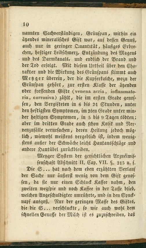 nannten Sachverſtändigen, Grünſpan, mithin ein ätzendes mineraliſches Gift war, auf deſſen Genuß, auch nur in geringer Quantität, häufiges Erbre⸗ chen, heftiger Leibſchmerz, Entzündung des Magens und des Darmkanals, und endlich der Brand und der Tod erfolgt. Mit dieſem Urtheil über den Cha⸗ rakter und die Wirkung des Grünſpans ſtimmt auch Metzgger überein, der die Kupferkalche, wozu der Grünſpan gehört, zur erſten Klaſſe der ätzenden oder freſſenden Gifte(venena acria, inflammato- ria, corrosiva) zählt, die im erſten Grade genoſ⸗ ſen, den Vergifteten in 6 bis 24 Stunden, unter den heftigſten Symptomen, im 2ten Grade unter min⸗ der heftigen Symptomen, in 5 bis 9 Tagen tödten; aber im dritten Grade auch ſchon Kolik und Ner⸗ venzufälle verurſachen, deren Heilung jedoch mög⸗ lich, wiewohl meiſtens vergeblich iſt, indem wenig⸗ ſtens außer der Schwäche leicht Hautausſchläge und andere Hautübel zurückbleiben. Metzger Syſtem der gerichtlichen Arzneiwiſ⸗ ſenſchaft Abſchnitt II. Cap. VII.§. 215 u. f. Die S.. hat nach dem eben erzählten Verlauf der Sache nur äußerſt wenig von dem Gift genoſ⸗ ſen, da ſie nur einen Schluck Kaffee nahm, den zweiten wegſpie und noch Kaffee in der Taſſe blieb, welchen Angeſchuldigter umrührte, und in den Spuck⸗ napf ausgoß. Nur der geringen Maſſe des Giftes, die die S.. verſchluckte, ſo wie auch wohl dem ſchnellen Genuſſe der Milch iſt es zuzuſchreiben, daß