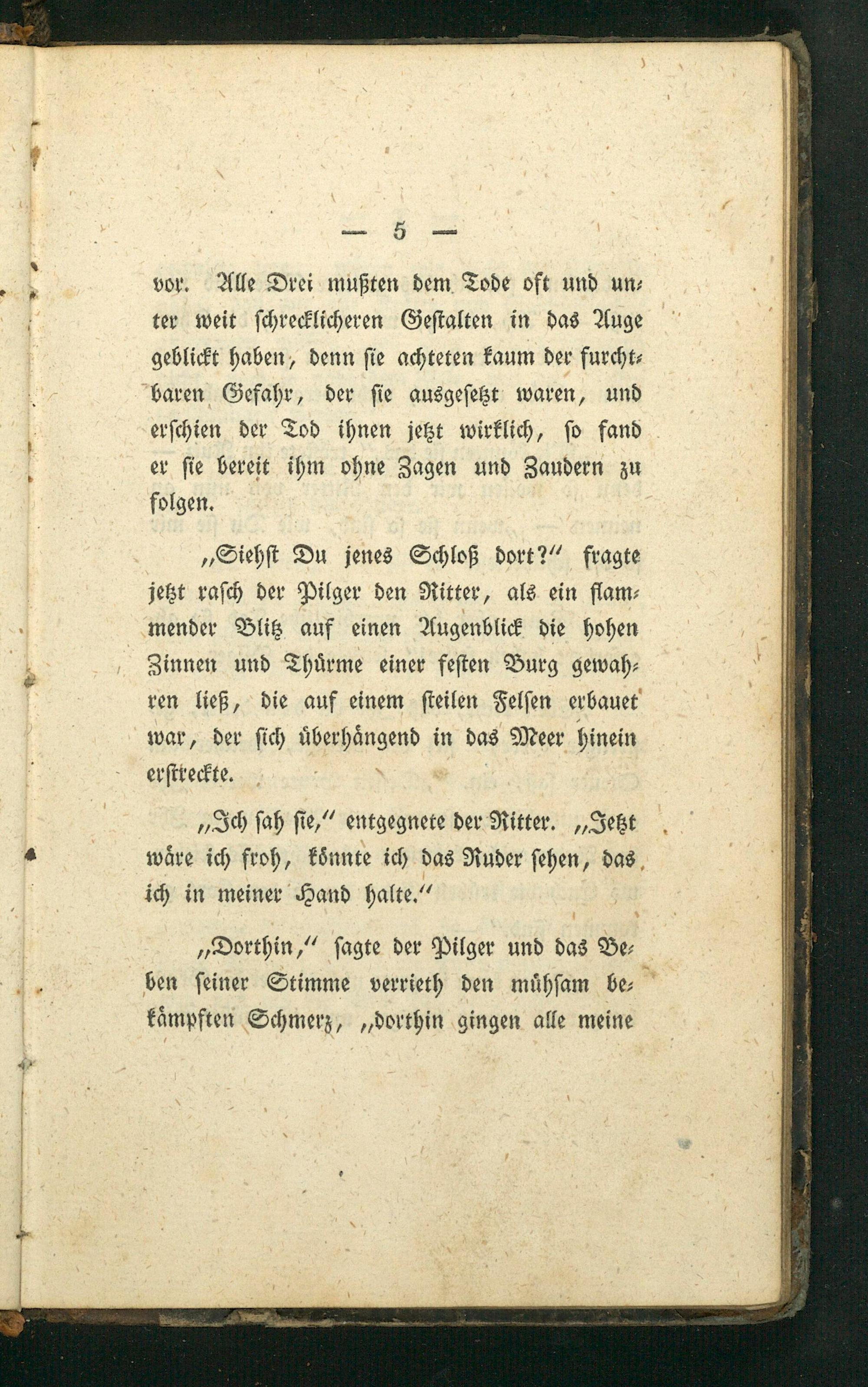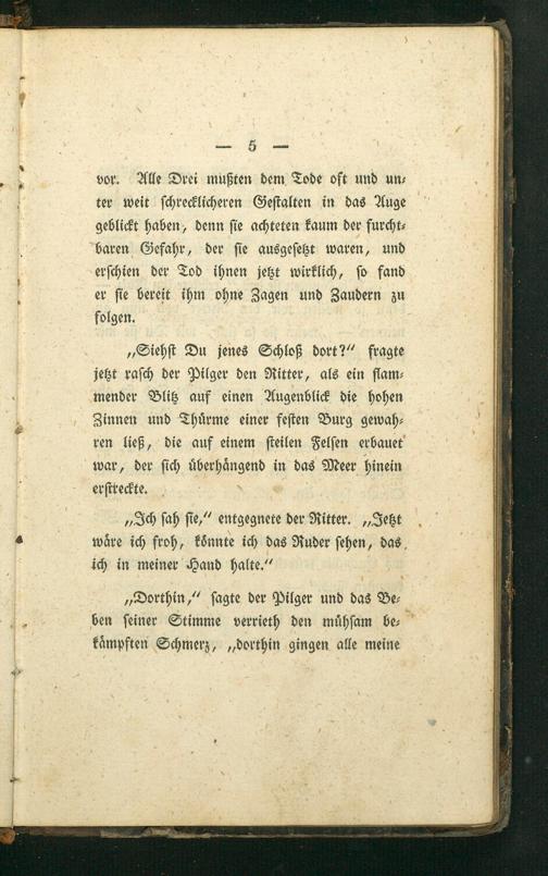„Siehſt Du jenes Schloß dort?“ fragte jetzt raſch der Pilger den Ritter, als ein flam⸗ mender Blitz auf einen Augenblick die hohen Zinnen und Thuͤrme einer feſten Burg gewah⸗ ren ließ, die auf einem ſteilen Felſen erbauet war, der ſich uͤberhaͤngend in das Meer hinein erſtreckte.