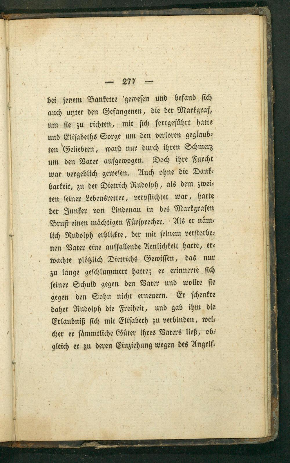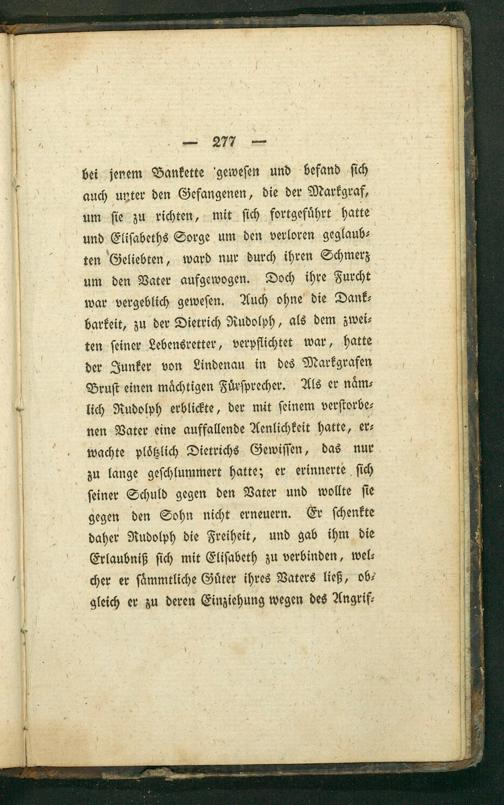 bei jenem Bankette geweſen und befand ſich auch unter den Gefangenen, die der Markgraf, um ſie zu richten, mit ſich fortgefuͤhrt hatte und Eliſabeths Sorge um den verloren geglaub⸗ ten Geliebten, ward nur durch ihren Schmerz um den Vater aufgewogen. Doch ihre Furcht war vergeblich geweſen. Auch ohne die Dank⸗ barkeit, zu der Dietrich Rudolph, als dem zwei⸗ ten ſeiner Lebensretter, verpflichtet war, hatte der Junker von Lindenau in des Markgrafen Bruſt einen maͤchtigen Fuͤrſprecher. Als er naͤm⸗ lich Rudolph erblickte, der mit ſeinem verſtorbe⸗ nen Vater eine auffallende Aenlichkeit hatte, er⸗ wachte plötzlich Dietrichs Gewiſſen, das nur