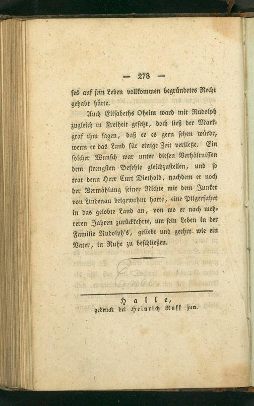 graf ihm ſagen, daß er es gern ſehen wuͤrde, wenn er das Land fuͤr einige Zeit verließe. Ein ſolcher Wunſch war unter dieſen Verhaͤltniſſen dem ſtrengſten Befehle gleichzuſtellen, und ſo trat denn Herr Curt Diethold, nachdem er noch der Vermaͤhlung ſeiner Nichte mit dem Junker von Lindenau beigewohnt hatte, eine Pilgerfahrt in das gelobte Land an, von wo er nach meh⸗ reren Jahren zuruͤckkehrte, um ſein Leben in der Familie Rudolph's, geliebt und geehrt wie ein Vater, in Ruhe zu beſchließen.