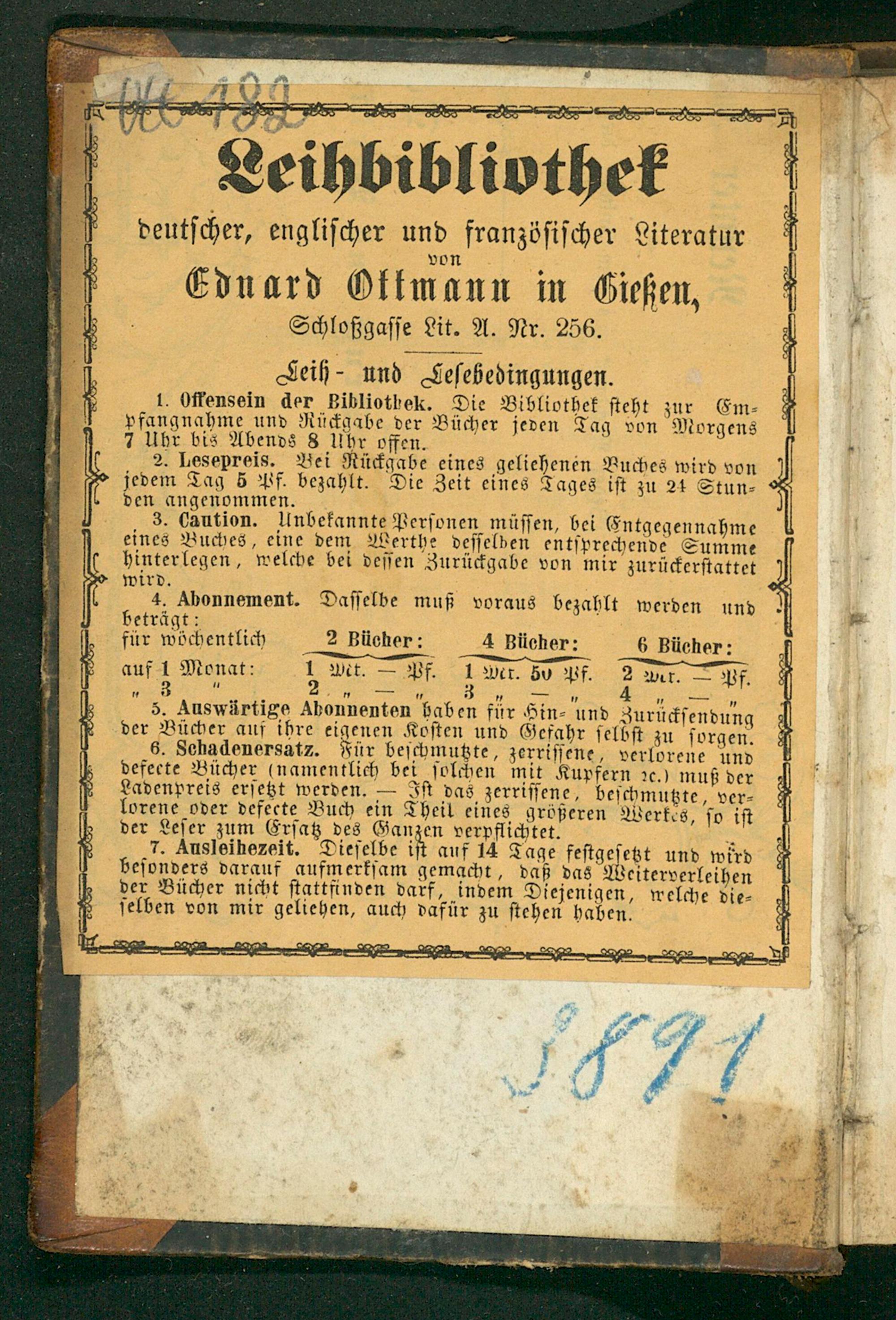 3. Caution. Unbekannte Perſonen müſſen, bei Entgegennahme eines Buches, eine dem Werthe deſſelben entſprechende Summe hinterlegen, welche bei deſſen Zurückgabe von mir zurückerſtattet wird.