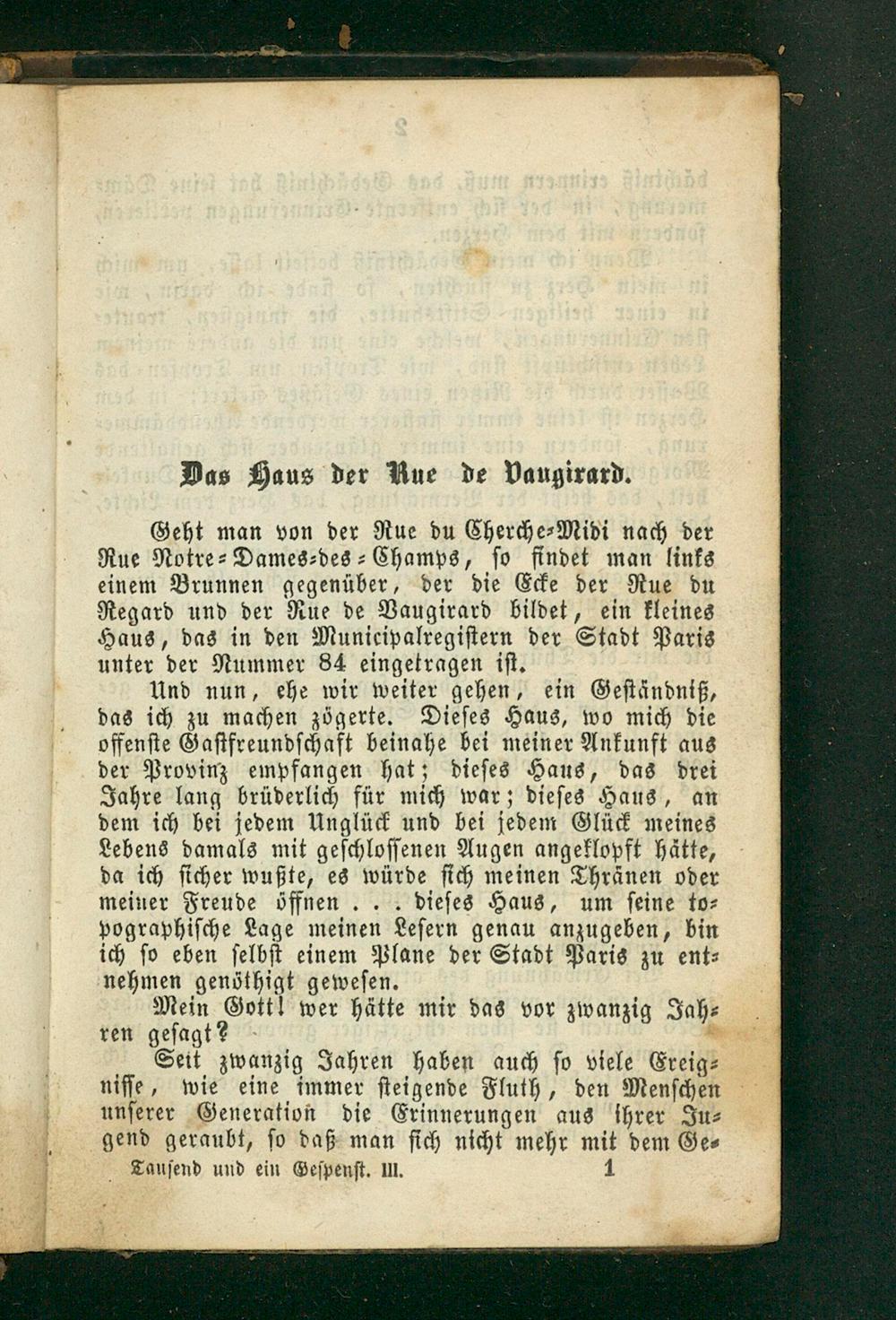 Und nun, ehe wir weiter gehen, ein Geſtändniß, das ich zu machen zögerte. Dieſes Haus, wo mich die offenſte Gaſtfreundſchaft beinahe bei meiner Ankunft aus der Provinz empfangen hat; dieſes Haus, das drei Jahre lang brüderlich für mich war; dieſes Haus, an dem ich bei jedem Unglück und bei jedem Glück meines Lebens damals mit geſchloſſenen Augen angeklopft hätte, da ich ſicher wußte, es würde ſich meinen Thränen oder meiner Freude öffnen,.. dieſes Haus, um ſeine to⸗ pographiſche Lage meinen Leſern genau anzugeben, bin ich ſo eben ſelbſt einem Plane der Stadt Paris zu ent⸗ nehmen genöthigt geweſen.