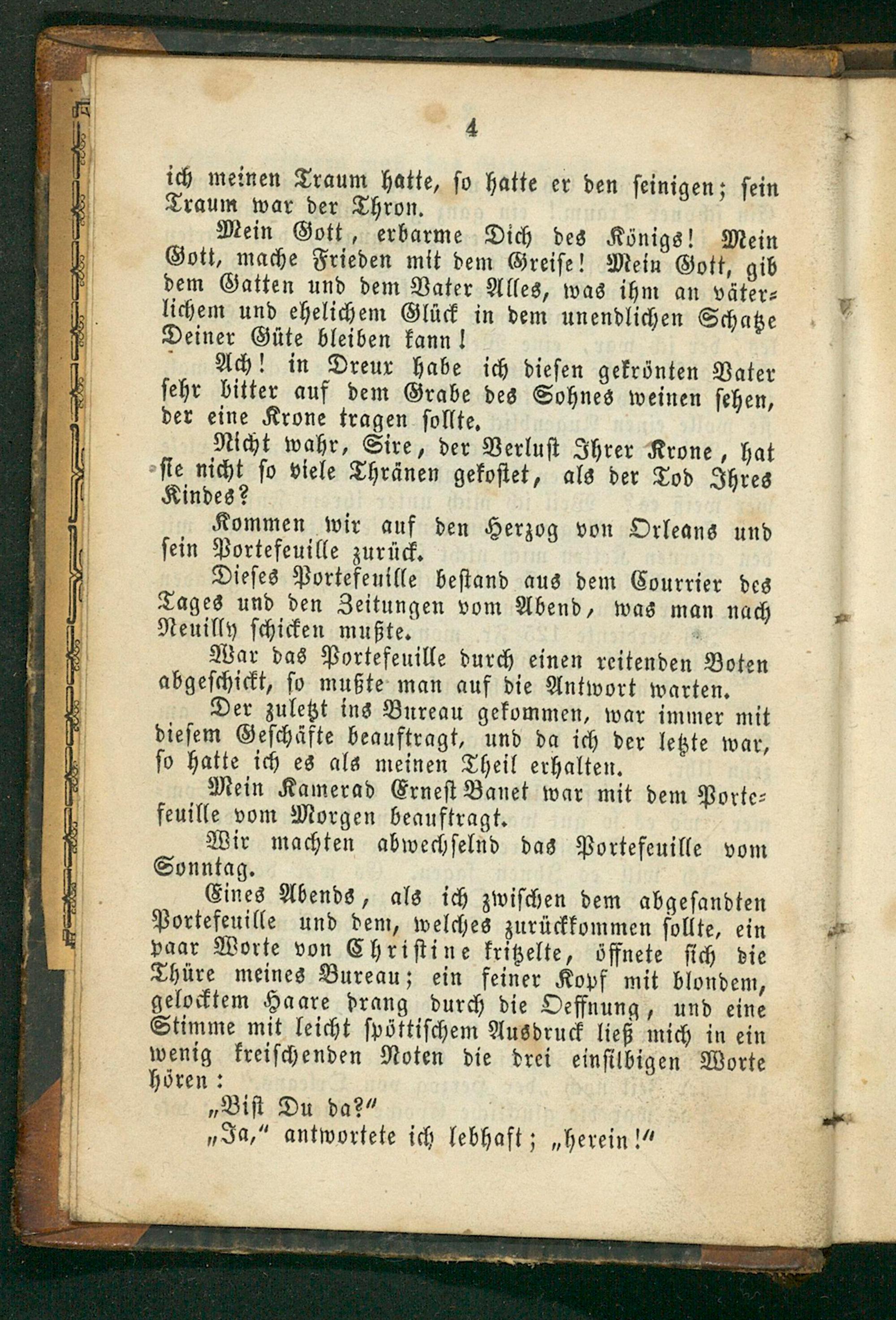Eines Abends, als ich zwiſchen dem abgeſandten Portefeuille und dem, welches zurückkommen ſollte, ein paar Worte von Chriſtine kritzelte, öffnete ſich die Thüre meines Bureau; ein feiner Kopf mit blondem, gelocktem Haare drang durch die Oeffnung, und eine Stimme mit leicht ſpöttiſchem Ausdruck ließ mich in ein wenig kreiſchenden Noten die drei einſilbigen Worte hören: