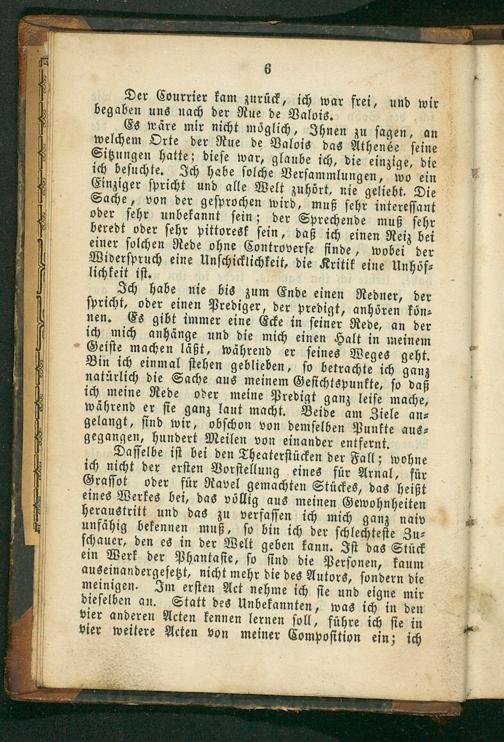 Es wäre mir nicht möglich, Ihnen zu ſagen, an welchem Orte der Rue de Valois das Athenée ſeine Sitzungen hatte; dieſe war, glaube ich, die einzige, die ich beſuchte. Ich habe ſolche Verſammlungen, wo ein Einziger ſpricht und alle Welt zuhört, nie geliebt. Die Sache, von der geſprochen wird, muß ſehr intereſſant oder ſehr unbekannt ſein; der Sprechende muß ſehr beredt oder ſehr pittoresk ſein, daß ich einen Reiz bei einer ſolchen Rede ohne Controverſe finde, wobei der Widerſpruch eine Unſchicklichkeit, die Kritik eine Unhöf⸗ lichkeit iſt.