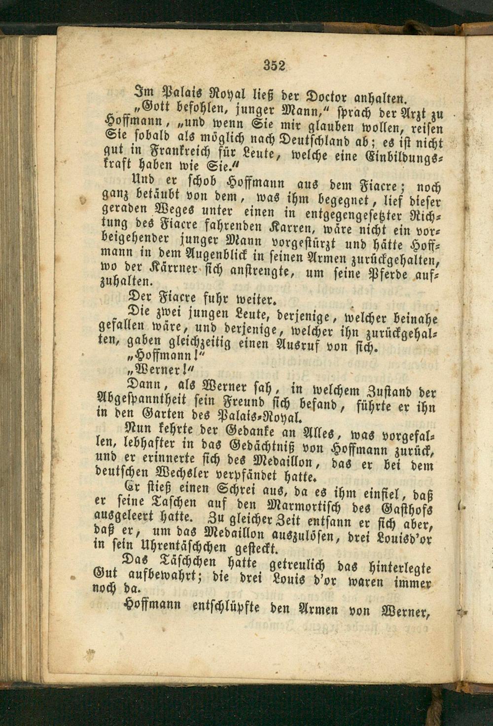 Er ſtieß einen Schrei aus, da es ihm einfiel, daß er ſeine Taſchen auf den Marmortiſch des Gaſthofs ausgeleert hatte. Zu gleicher Zeit entſann er ſich aber, daß er, um das Medaillon auszulöſen, drei Louisd'or in ſein Uhrentäſchchen geſteckt.