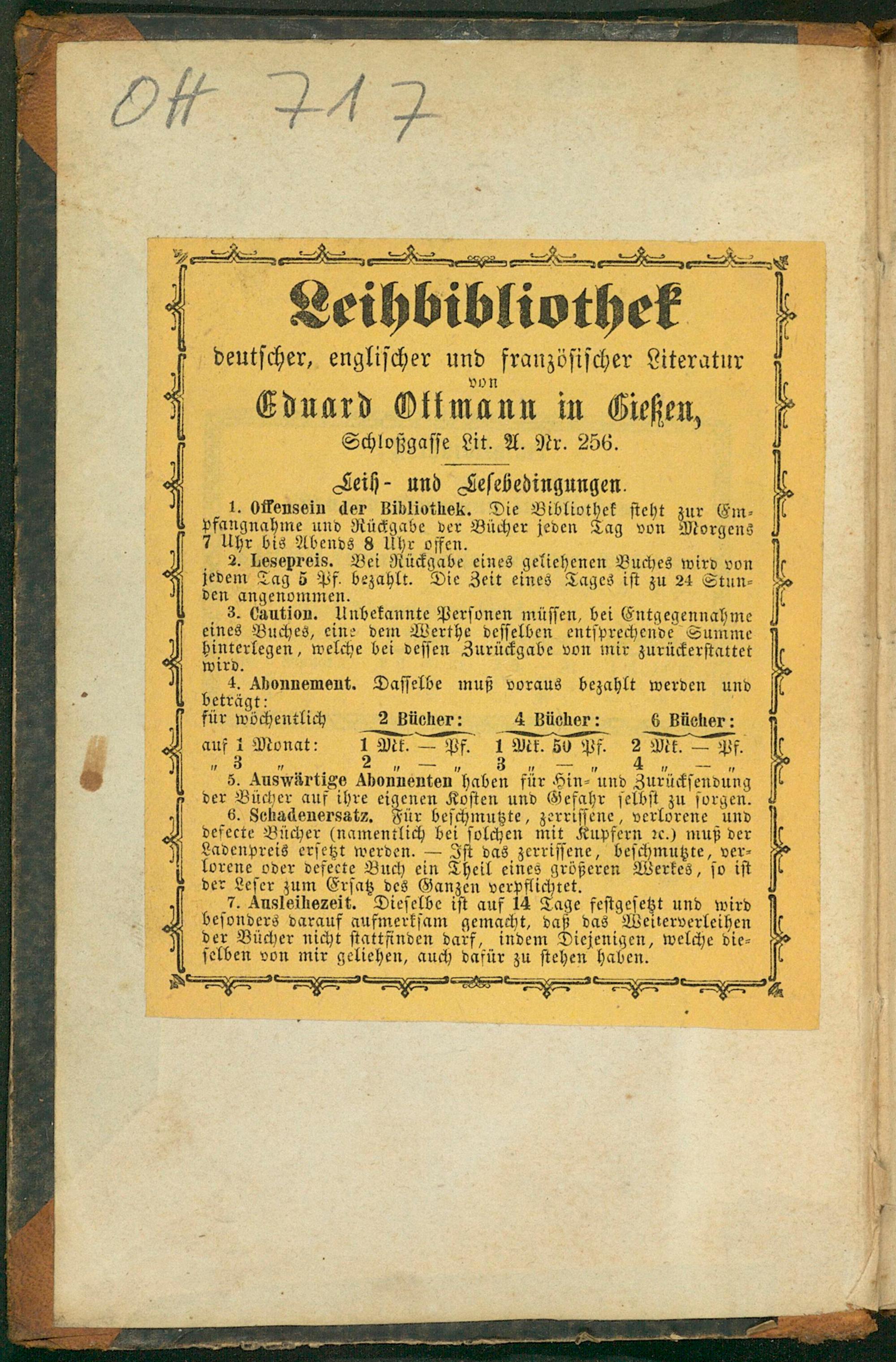 3„—„ 5. Auswärtige Abonnenten haben für Hin⸗ und Zurückſendung der Bücher auf ihre eigenen Koſten und Gefahr ſelbſt zu ſorgen. 6. Schadenersatz. Für beſchmutzte, zerriſſene, verlörene und defecte Bücher(namentlich bei ſolchen mit Kupfern ꝛc.) muß der Ladenpreis erſetzt werden.— Iſt vas zerriſſene, beſchmutzte, ver⸗ lorene oder deferte Buch ein Theil eines größeren Werkes, ſo iſt der Leſer zum Erſatz des Ganzen verpflichtet. 7. Ausleihezeit. Dieſelbe iſt auf 14 Tage feſtgeſetzt und wird beſonders darauf aufmerkſam gemacht, daß das Weiterverleihen der Bücher nicht ſtattfinden darf, indem Diejenigen, welche die⸗ ſelben von mir geliehen, auch dafür zu ſtehen haben.