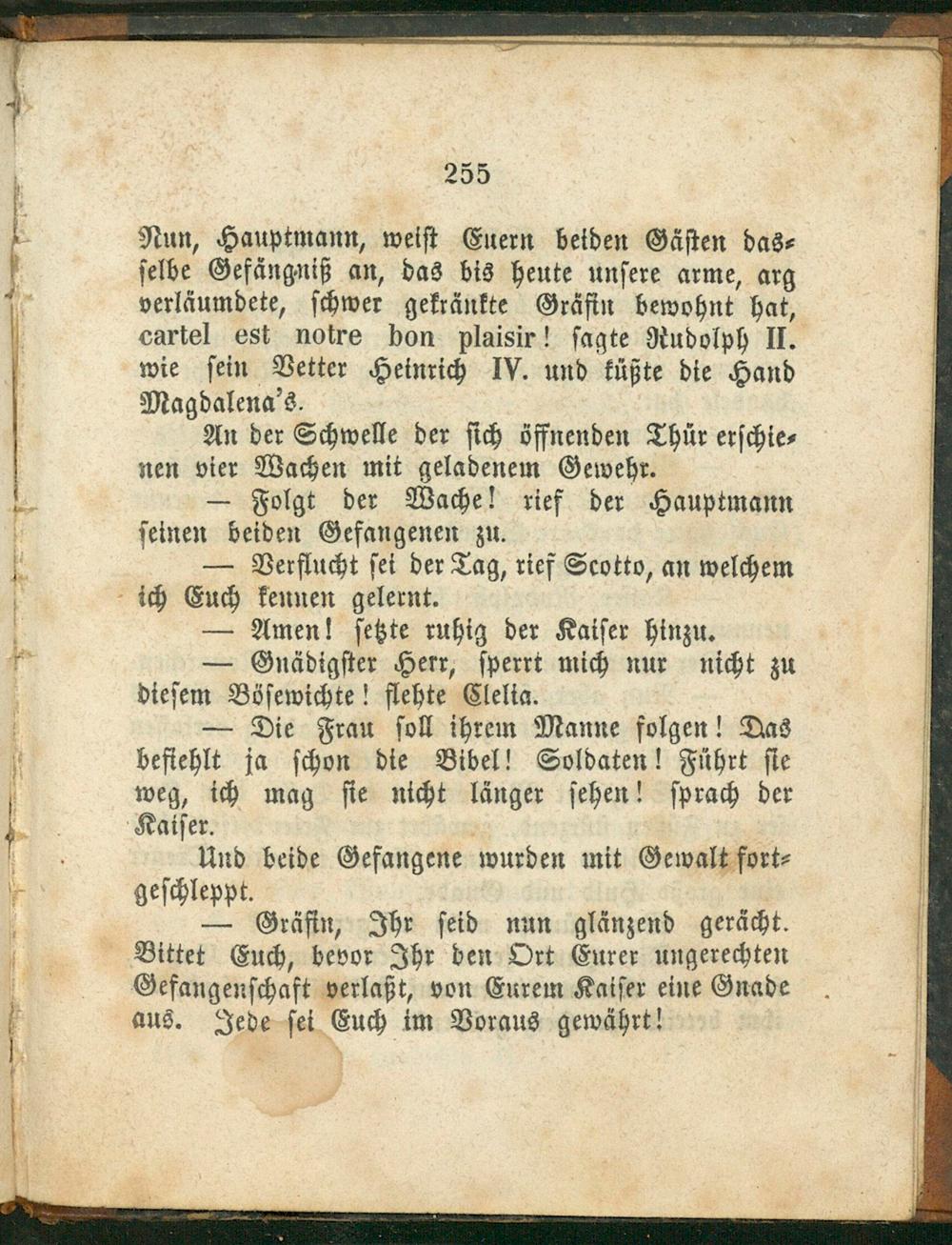 — Gräfin, Ihr ſeid nun glänzend gerächt. Bittet Euch, bevor Ihr den Ort Eurer ungerechten Gefangenſchaft verlaßt, von Eurem Kaiſer eine Gnade aus. Jede ſei Euch im Voraus gewährt!