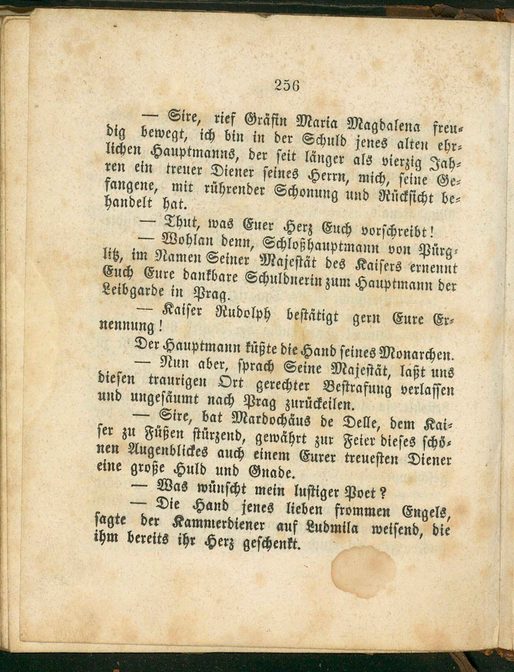 — Nun aber, ſprach Seine Majeſtät, laßt uns dieſen traurigen Ort gerechter Beſtrafung verlaſſen und ungeſäumt nach Prag zurückeilen. — Sire, bat Mardochäus de Delle, dem Kai⸗ ſer zu Füßen ſtürzend, gewährt zur Feier dieſes ſchö⸗ nen Augenblickes auch einem Eurer treueſten Diener eine große Huld und Gnade. — Was wünſcht mein luſtiger Pvet? — Die Hand jenes lieben frommen Engels, ſagte der Kammerdiener auf Ludmila weiſend, die ihm bereits ihr Herz geſchenkt.