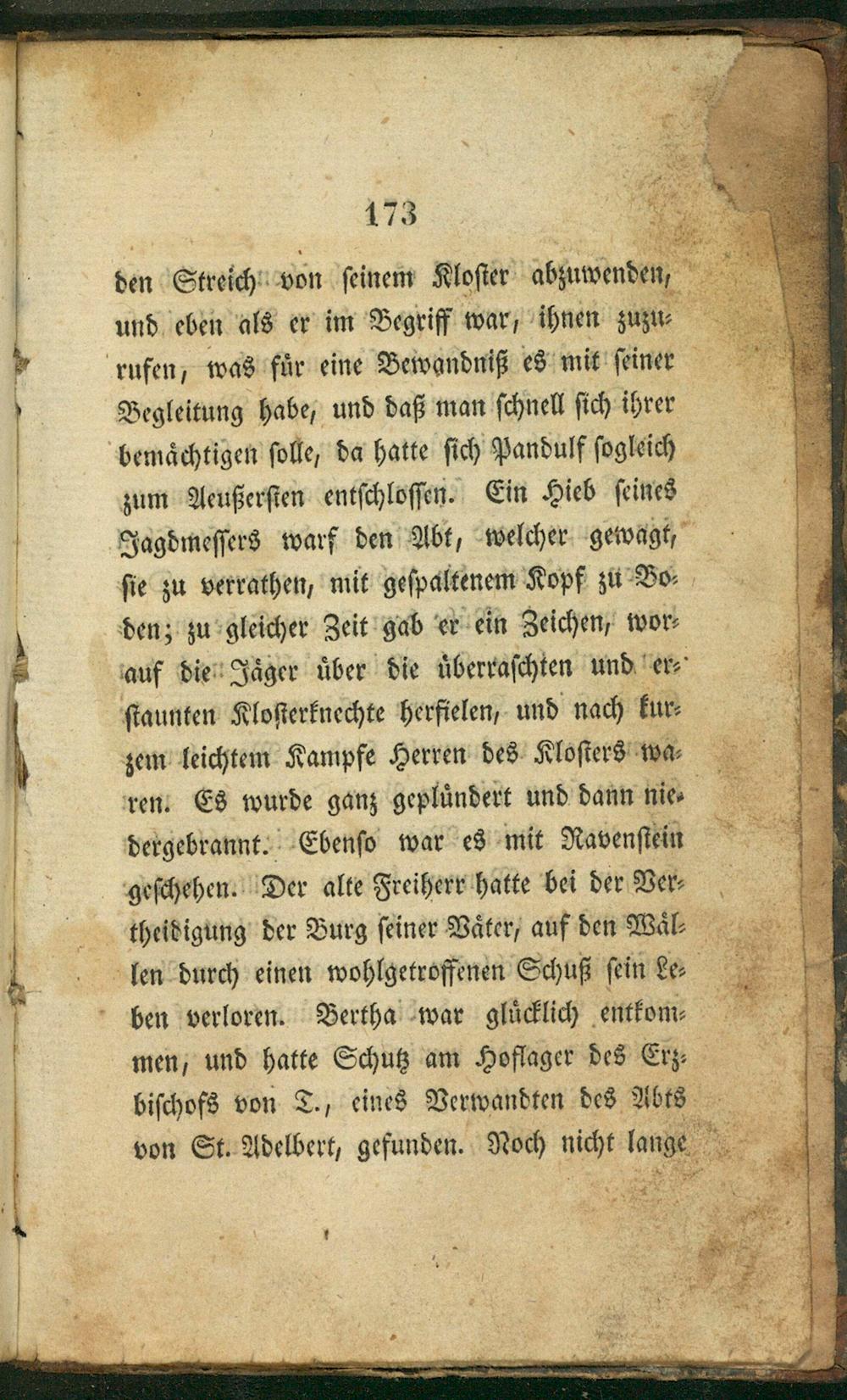 den Streich von ſeinem Kloſier abjuwenden, und eben als er im Begriff war, ihnen zuzu⸗ rufen, was fur eine Bewandniß es mit ſeiner Begleitung habe, und daß man ſchnell ſich ihrer bemaͤchtigen ſolle, da hatte ſich Panduff ſogleich zum Aeußerſten entſchloſſen. Ein Hieb ſeines Jagdmeſſers warf den Abt, welcher gewagt, ſie zu verrathen, mit geſpaltenem Kopf zu Bo⸗ den; zu gleicher Zeit gab er ein Zeichen, wor⸗ auf die Jaͤger uͤber die uͤberraſchten und er⸗ ſtaunten Kloſterknechte herfielen, und nach kur⸗ zem leichtem Kampfe Herren des Kloſiers wa⸗ ren. Es wurde ganz geplundert und dann nie⸗ dergebrannt. Ebenſo war es mit Ravenſtein geſchehen. Der alte Freiherr hatte bei der Ver⸗ theidigung der Burg ſeiner Vaͤter, auf den Waͤl⸗ len durch einen wohlgetroffenen Schuß ſein Le⸗ ben verloren. Bertha war glucklich entkom⸗ men, und hatte Schutz am Hoflager des Erz⸗ biſchofs von T., eines Verwandten des Abts von St. Adelbert, gefunden. Noch nicht lan