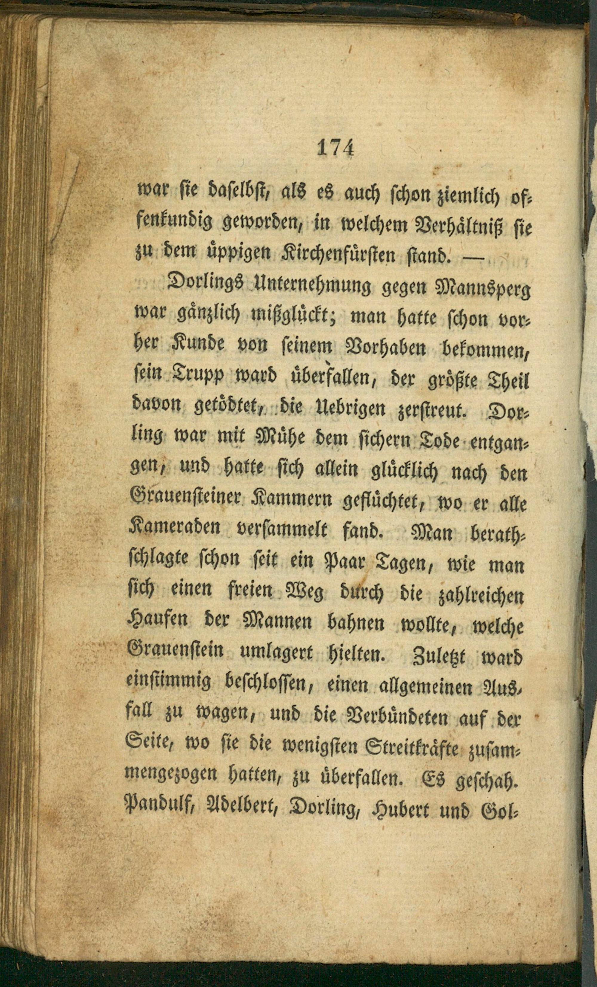 zu dem üppigen Kirchenfurſten ſtand.— Dorlings Unternehmung gegen Mannsperg war gaͤnzlich mißgluckt; man hatte ſchon vor⸗ her Kunde von ſeinem Vorhaben bekommen, ſein Trupp ward uͤberfallen, der groͤßte Theil davon getödtet, die Uebrigen zerſtreut. Dor⸗ ling war mit Muͤhe dem ſichern Tode entgan⸗ gen, und hatte ſich allein gluͤcklich nach den Grauenſteiner Kammern geflͤchtet, wo er alle Kameraden verſammelt fand. Man berath⸗ ſchlagte ſchon ſeit ein Paar Tagen, wie man ſich einen freien Weg durch die zahlreichen Haufen der Mannen bahnen wollte, welche Grauenſtein umlagert hielten. Zuletzt ward einſtimmig beſchloſſen, einen allgemeinen Aus⸗ fall zu wagen, und die Verbuͤndeten auf der Seite, wo ſie die wenigſten Streitkraͤfte zuſam⸗ mengezogen hatten, zu uͤberfallen. Es geſchah. 3 Pandulf, Adelbert, Dorling, Hubert und Gol⸗