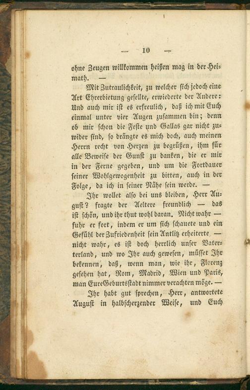 ohne Zeugen willkommen heißen mag in der Hei⸗ math.— Mit Zutraulichkeit, zu welcher ſich jedoch eine Art Ehrerbietung geſellte, erwiederte der Andere: Und auch mir iſt es erfreulich, daß ich mit Euch einmal unter vier Augen zuſammen bin; denn ob mir ſchon die Feſte und Gallas gar nicht zu⸗ wider ſind, ſo drängte es mich doch, auch meinen Herrn recht von Herzen zu begrüßen, ihm für alle Beweiſe der Gunſt zu danken, die er mir in der Ferne gegeben, und um die Fortdauer ſeiner Wohlgewogenheit zu bitten, auch in der Folge, da ich in ſeiner Nähe ſein werde.— Ihr wollet alſo bei uns bleiben, Herr Au⸗ guſt? fragte der Aeltere freundlich— das iſt ſchön, und ihr thut wohl daran. Nicht wahr— fuhr er fort, indem er um ſich ſchauete und ein Gefühl der Zufriedenheit ſein Antlitz erheiterte— nicht wahr, es iſt doch herrlich unſer Vater⸗ terland, und wo Ihr auch geweſen, müſſet Ihr bekennen, daß, wenn man, wie ihr, Florenz geſehen hat, Rom, Madrid, Wien und Paris, man EureGeburtsſtadt nimmer verachten möge.— Ihr habt gut ſprechen, Herr, antwortete Auguſt in halbſcherzender Weiſe, und Euch