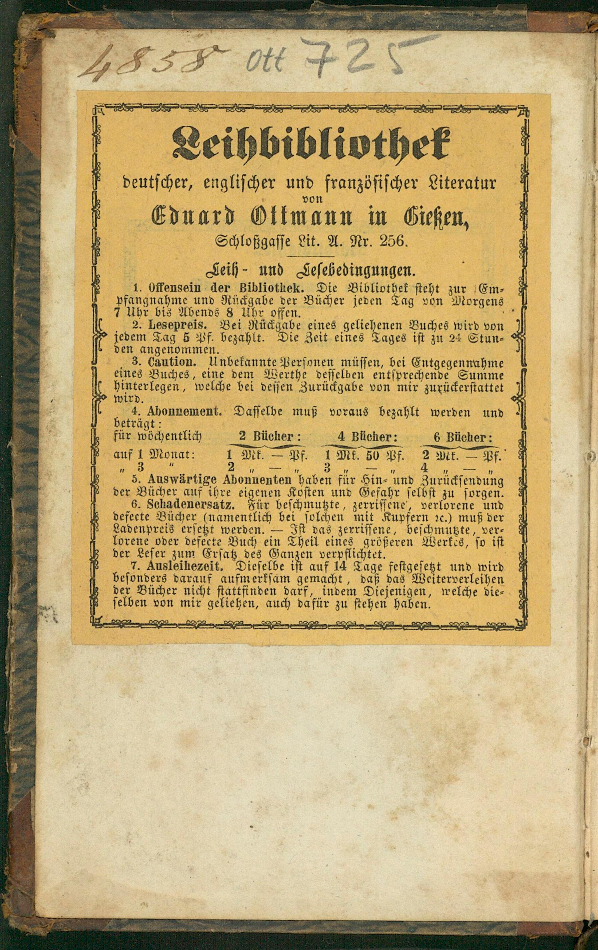 Jeih und eſebedingungen.. 1. Offensein der Bibliothek. Die Bibliothek ſteht zur Em⸗ ₰ pfangnahme nd Rückgabe der Bücher jeden Tag von Morgens 7 Uhr bis Abends 8 Uhr offen. 3 S2 . Lesepreis. Bei Rückgabe eines geliehenen Buches wird von) djedem Tag 5 Pf bezahlt. Die Zeit eines Tages iſt zu 24 Stun⸗ 4 den angenommen. 3. Cäution. Unbekannte Perſonen müſſen, bei Entgegennahme eines Buches, eine dem Werthe deſſelben entſprechende Summe hinterlegen, welche bei deſſen Zurückgabe von mir zurückerſtattet
