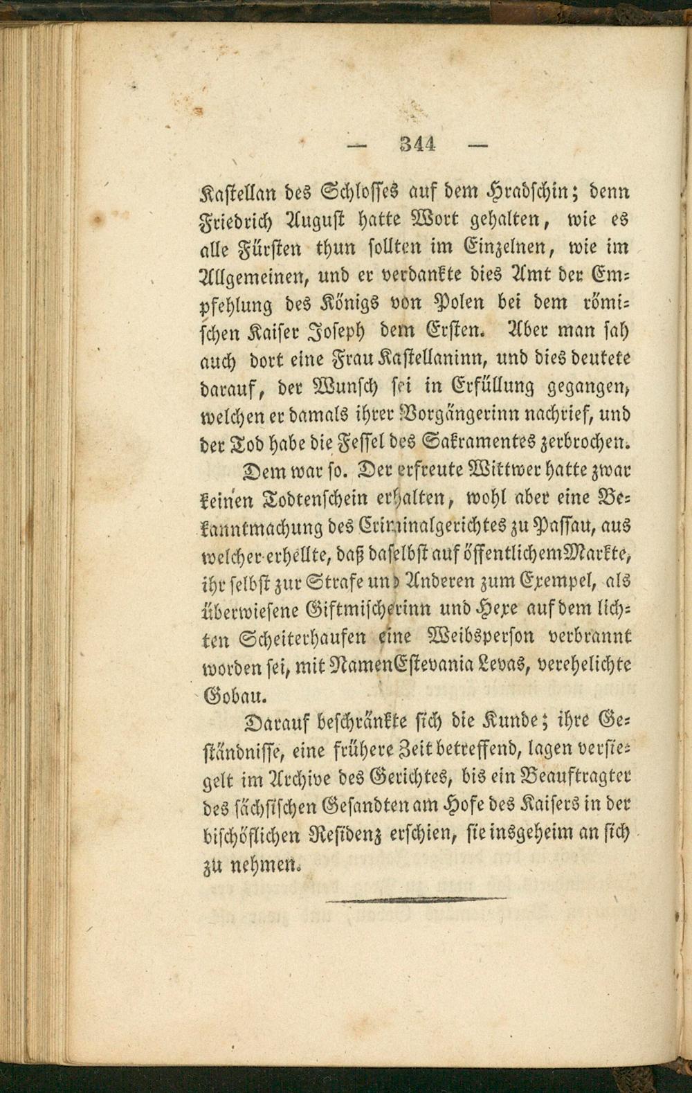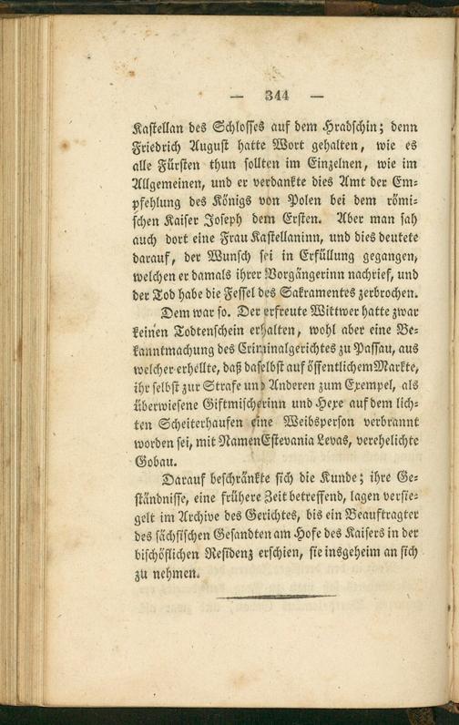 Kaſtellan des Schloſſes auf dem Hradſchin; denn Friedrich Auguſt hatte Wort gehalten, wie es alle Fürſten thun ſollten im Einzelnen, wie im Allgemeinen, und er verdankte dies Amt der Em⸗ pfehlung des Königs von Polen bei dem römi⸗ ſchen Kaiſer Joſeph dem Erſten. Aber man ſah auch dort eine Frau Kaſtellaninn, und dies deutete darauf, der Wunſch ſei in Erfüllung gegangen, welchen er damals ihrer Vorgängerinn nachrief, und der Tod habe die Feſſel des Sakramentes zerbrochen.