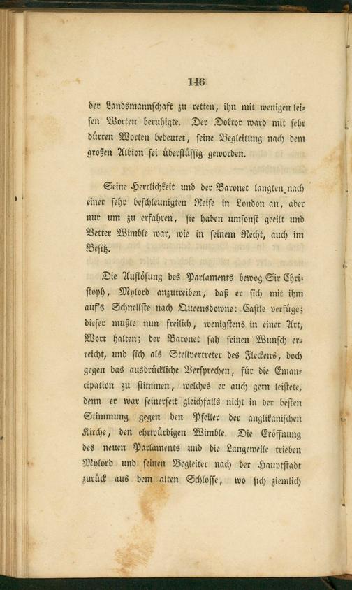 Die Aufloͤſung des Parlaments bewog Sir Chri⸗ ſtoph, Mylord anzutreiben, daß er ſich mit ihm auf's Schnellſte nach Queensdowne: Caſtle verfuge; dieſer mußte nun freilich, wenigſtens in einer Art, Wort halten; der Baronet ſah ſeinen Wunſch er⸗ reicht, und ſich als Stellvertreter des Fleckens, doch gegen das ausdruckliche Verſprechen, fuͤr die Eman⸗ cipation zu ſtimmen, welches er auch gern leiſtete, denn er war ſeinerſeit gleichfalls nicht in der beſten Stimmung gegen den Pfeiler der anglikaniſchen Kirche, den ehrwuͤrdigen Wimble. Die Eroffnung des neuen Parlaments und die Langeweile trieben Mylord und ſeinn Begleiter nach der Hauptſtadt zuruck aus dem alten Schloſſe, wo ſich ziemlich