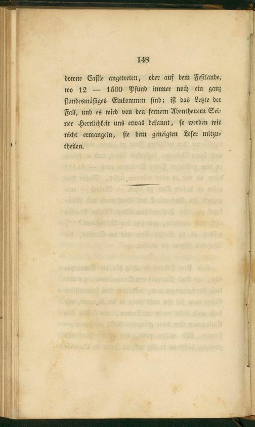 downe Caſtle angetreten, oder auf dem Feſtlande, wo 12— 1500 Pfund immer noch ein ganz ſtandesmäͤßiges Einkommen ſind; iſt das Letzte der Fall, und es wird von den fernern Abentheuern Sei⸗ ner Herrlichkeit uns etwas bekannt, ſo werden wir nicht ermangeln, ſie dem geneigten Leſer mitzu⸗ theilen.
