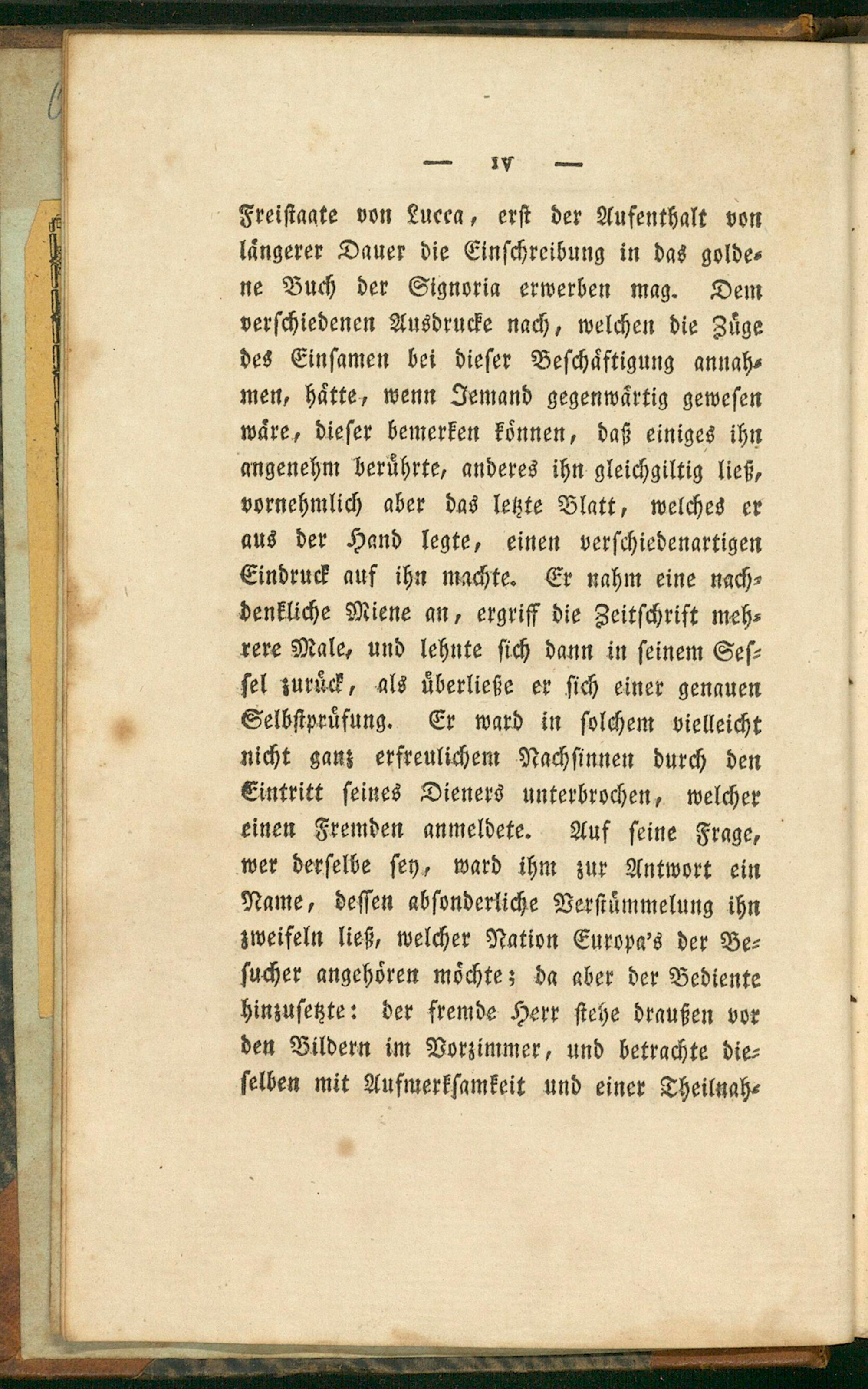 Freiſtagte von Lueea, erſt der Aufenthalt von laͤngerer Dauer die Einſchreibung in das golde⸗ ne Buch der Signoria erwerben mag. Dem verſchiedenen Ausdrucke nach, welchen die Zuͤge des Einſamen bei dieſer Beſchaͤftigung annah⸗ men, haͤtte, wenn Jemand gegenwaͤrtig geweſen waͤre, dieſer bemerken koͤnnen, daß einiges ihn angenehm beruͤhrte, anderes ihn gleichgiltig ließ, vornehmlich aber das letzte Blatt, welches er aus der Hand legte, einen verſchiedenartigen Eindruck auf ihn machte. Er nahm eine nach⸗ denkliche Miene an, ergriff die Zeitſchrift meh⸗ rere Male, und lehnte ſich dann in ſeinem Seſ⸗ ſel zuruͤck, als uͤberließe er ſich einer genauen Selbſtpruͤfung. Er ward in ſolchem vielleicht nicht ganz erfreulichem Nachſinnen durch den Eintritt ſeines Dieners unterbrochen, welcher einen Fremden anmeldete. Auf ſeine Frage, wer derſelbe ſey, ward ihm zur Antwort ein Name, deſſen abſonderliche Verſtuͤmmelung ihn zweifeln ließ, welcher Nation Europa's der Be⸗ ſucher angehoren moͤchte; da aber der Bediente hinzuſetzte: der fremde Hert ſtehe draußen vor den Bildern im Vorzimmer, und betrachte die⸗ ſelben mit Aufmerkſamkeit und einer Theilnah⸗