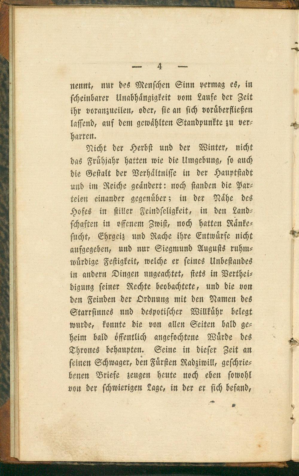 Richt der Herbſt und der Winter, nicht das Fruͤhjahr hatten wie die Umgebung, ſo auch die Geſtalt der Verhaͤltniſſe in der Hauptſtadt und im Reiche geaͤndert: noch ſtanden die Par⸗ teien einander gegenuͤber; in der Naͤhe des Hofes in ſtiller Feindſeligkeit, in den Land⸗ ſchaften in offenem Zwiſt, noch hatten Ranke⸗ ſucht, Ehrgeiz und Rache ihre Entwuͤrfe nicht aufgegeben, und nur Siegmund Auguſts ruhm⸗ wuͤrdige Feſtigkeit, welche er ſeines Unbeſtandes in andern Dingen ungeachtet, ſtets in Verthei⸗ digung ſeiner Rechte beobachtete, und die von den Feinden der Ordnung mit den Namen des Starrſinnes und despotiſcher Willkuͤhr belegt wurde, konnte die von allen Seiten bald ge⸗ heim bald oͤffentlich angefochtene Wuͤrde des Thrones behaupten. Seine in dieſer Zeit an ſeinen Schwager, den Fuͤrſten Radziwill, geſchrie⸗ benen Briefe zeugen heute noch eben ſowohl vyn der ſchwierigen Lage, in der er ſich befand,