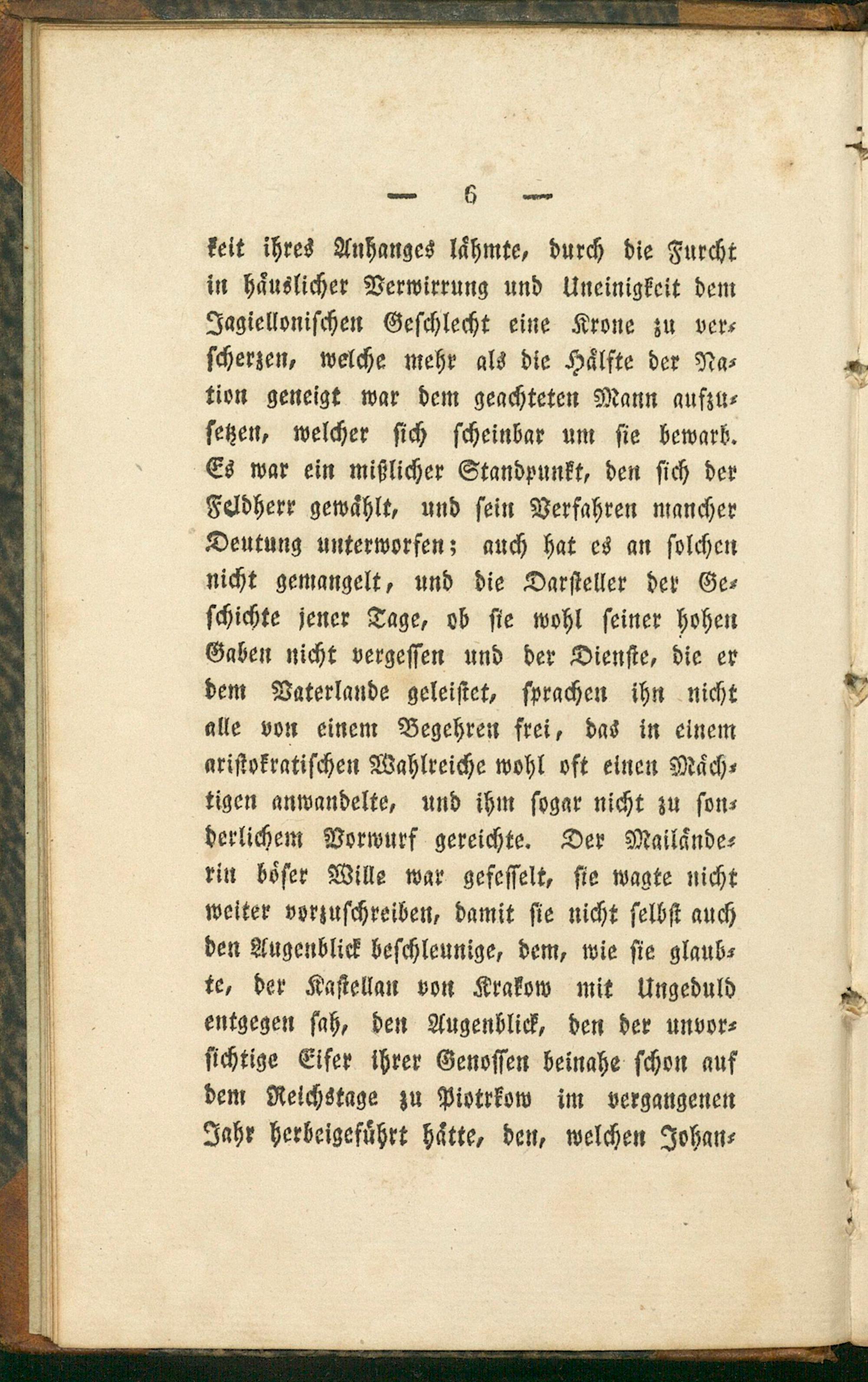 keit ihres Anhanges laͤhmte, durch die Furcht in haͤuslicher Verwirrung und Uneinigkeit dem Jagiellvniſchen Geſchlecht eine Krone zu ver⸗ ſcherzen, welche mehr als die Haͤlfte der Na⸗ tion geneigt war dem geachteten Mann außzu⸗ ſetzen, welcher ſich ſcheinbar um ſie bewarb. Es war ein mißlicher Standpunkt, den ſich der Feldherr gewaͤhlt, und ſein Verfahren mancher Deutung unterworfen; auch hat es an ſolchen nicht gemangelt, und die Darſteller der Ge⸗ ſchichte jener Tage, ob ſie wohl ſeiner hohen Gaben nicht vergeſſen und der Dienſte, die er dem PVaterlande geleiſtet, ſprachen ihn nicht alle von einem Begehren frei, das in einem ariſtokratiſchen Wahlreiche wohl oft einen Maͤch⸗ tigen anwandelte, und ihm ſogar nicht zu ſon⸗ derlichem Vorwurf gereichte. Der Mailaͤnde⸗ rin boͤſer Wille war gefeſſelt, ſie wagte nicht weiter vorzuſchreiben, damit ſie nicht ſelbſt auch den Augenblick beſchleunige, dem, wie ſie glaub⸗ te, der Kaſtellan von Krakow mit Ungeduld entgegen ſah, den Augenblick, den der unvor⸗ ſichtige Eifer ihrer Genoſſen beinahe ſchon auf dem Reichstage zu Piotrkow im vergangenen Jahr herbeigefuͤhrt haͤtte, den, welchen Johan⸗