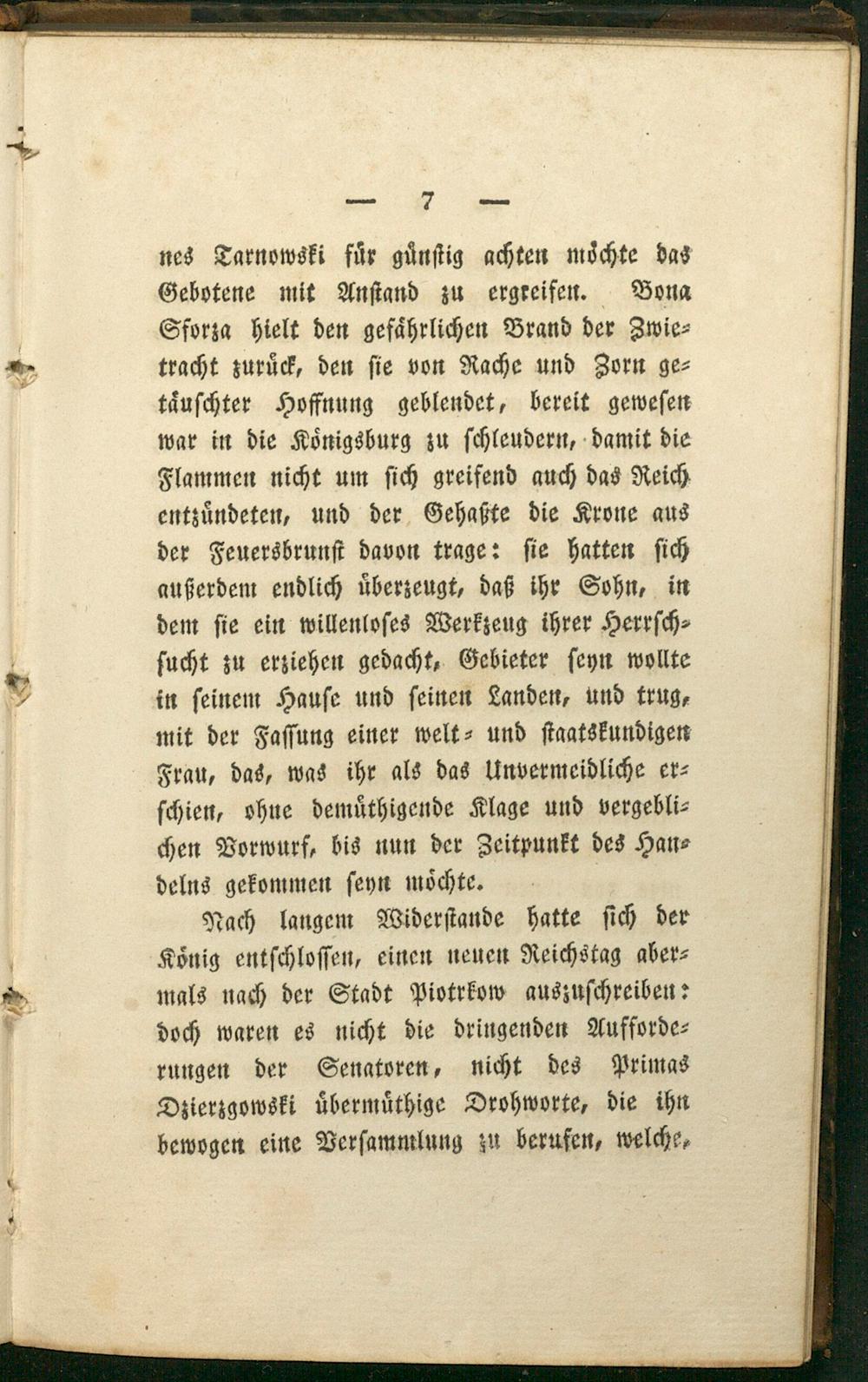 nes Tarnowoki fuͤr guͤnſtig achten moͤchte das Gebotene mit Anſtand zu ergreifen. Bona Sforza hielt den gefaͤhrlichen Brand der Zwie⸗ tracht zuruͤck, den ſie von Rache und Zorn ge⸗ taͤuſchter Hoffnung geblendet, bereit geweſen war in die Koͤnigsburg zu ſchleudern, damit die Flammen nicht um ſich greifend auch das Reich entzuͤndeten, und der Gehaßte die Krone aus der Feuersbrunſt davon trage: ſie hatten ſich außerdem endlich uͤberzeugt, daß ihr Sohn, in dem ſie ein willenloſes Werkzeug ihrer Herrſch⸗ ſucht zu erziehen gedacht, Gebieter ſeyn wollte in ſeinem Hauſe und ſeinen Landen, und trug⸗ mit der Faſſung einer welt⸗ und ſtaatskundigen Frau, das, was ihr als das Unvermeidliche er⸗ ſchien, ohue demuͤthigende Klage und vergebli⸗ chen Vorwurf, bis nun der Zeitpunkt des Han⸗ delns gekommen ſeyn moͤchte.