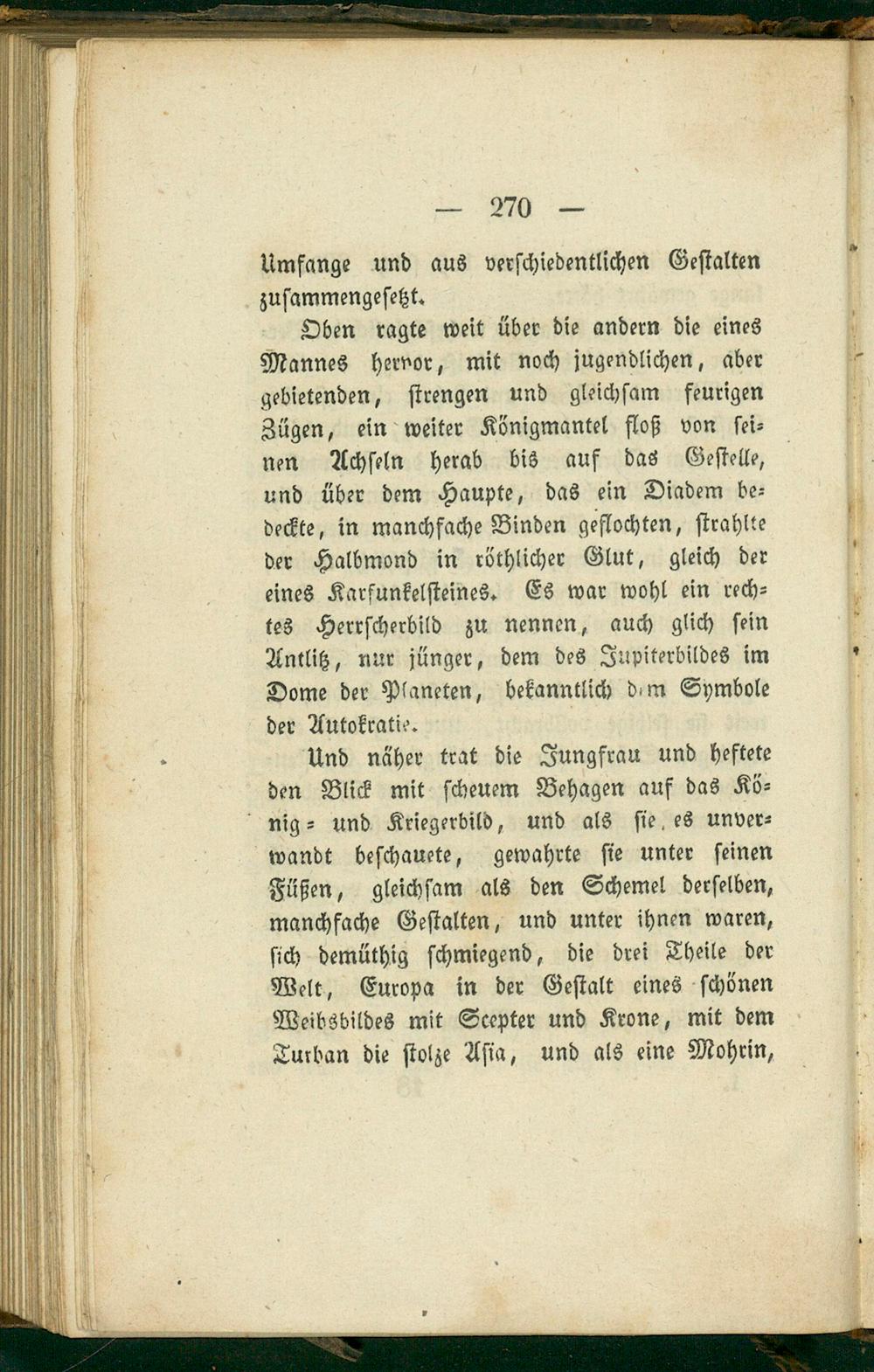 Oben ragte weit über die andern die eines Mannes hernor, mit noch jugendlichen, aber gebietenden, ſtrengen und gleichſam feurigen Zügen, ein weiter Königmantel floß von ſei⸗ nen Achſeln herab bis auf das Geſtelle, und über dem Haupte, das ein Diadem be⸗ deckte, in manchfache Binden geflochten, ſtrahlte der Halbmond in röthlicher Glut, gleich der eines Karfunkelſteines. Es war wohl ein rech⸗ tes Herrſcherbild zu nennen, auch glich ſein Antlitz, nur jünger, dem des Jupiterbildes im Dome der Planeten, bekanntlich dem Symbole der Autokratie.
