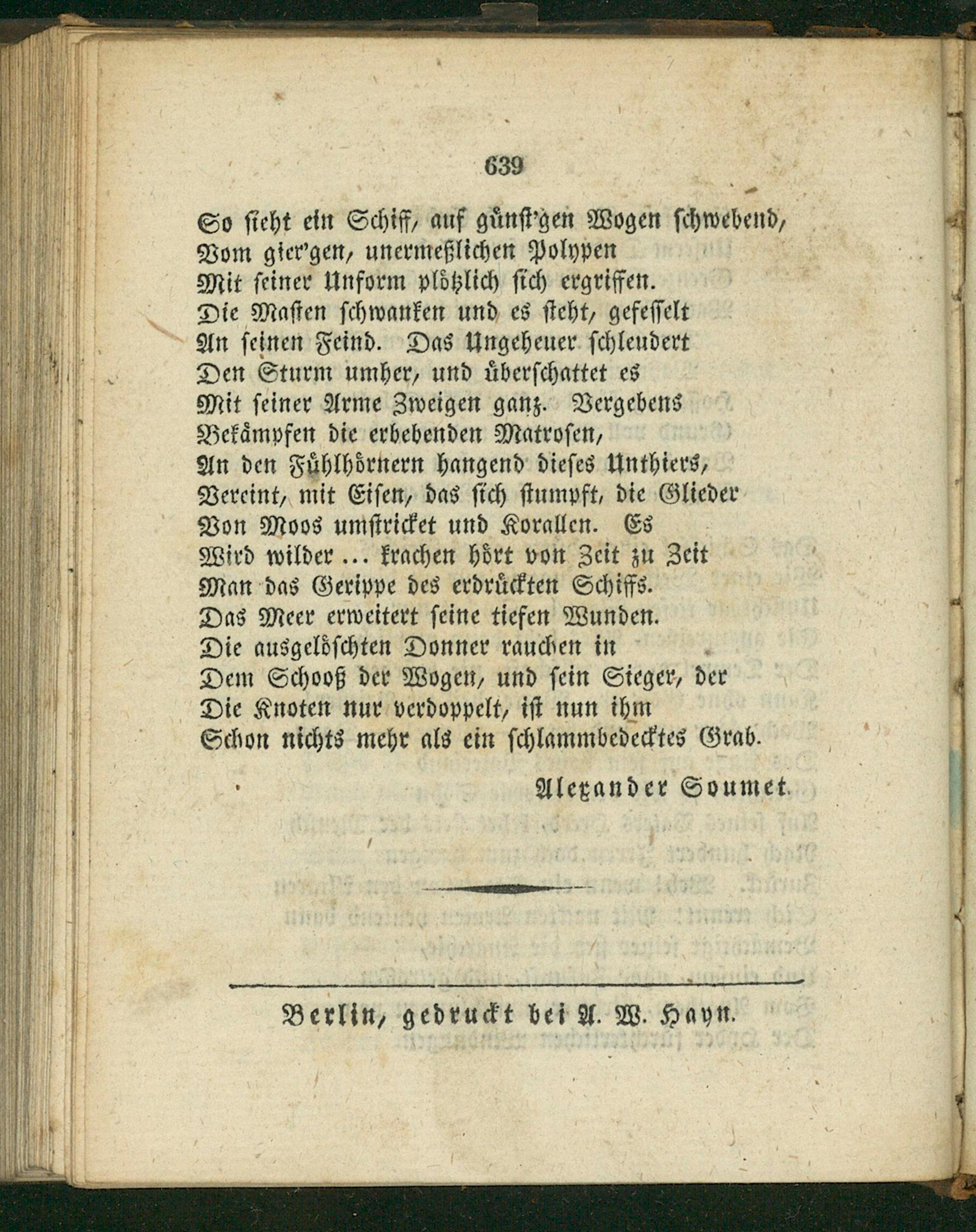 Vom gier'gen, unermeßlichen Polypen Mit ſeiner Unform ploͤtzlich ſich ergriffen. Die Maſten ſchwanken und es ſteht, gefeſſelt An ſeinen Feind. Das Ungeheuer ſchleudert Den Sturm umher, und uͤberſchattet es Mit ſeiner Arme Zweigen ganz. Vergebens Bekaͤmpfen die erbebenden Matroſen, An den Fuͤhlhoͤrnern hangend dieſes Unthiers, Vereint, mit Eiſen, das ſich ſtumpft, die Glieder Von Moos umſtricket und Korallen. Es Wird wilder... krachen hoͤrt von Zeit zu Zeit Man das Gerippe des erdruͤckten Schiffs. Das Meer erweitert ſeine tiefen Wunden. Die ausgeloͤſchten Donner rauchen in. Dem Schooß der Wogen, und ſein Sieger, der 8 Die Knoten nur verdoppelt, iſt nun ihm . Schon nichts mehr als ein ſchlammbedecktes Grab.