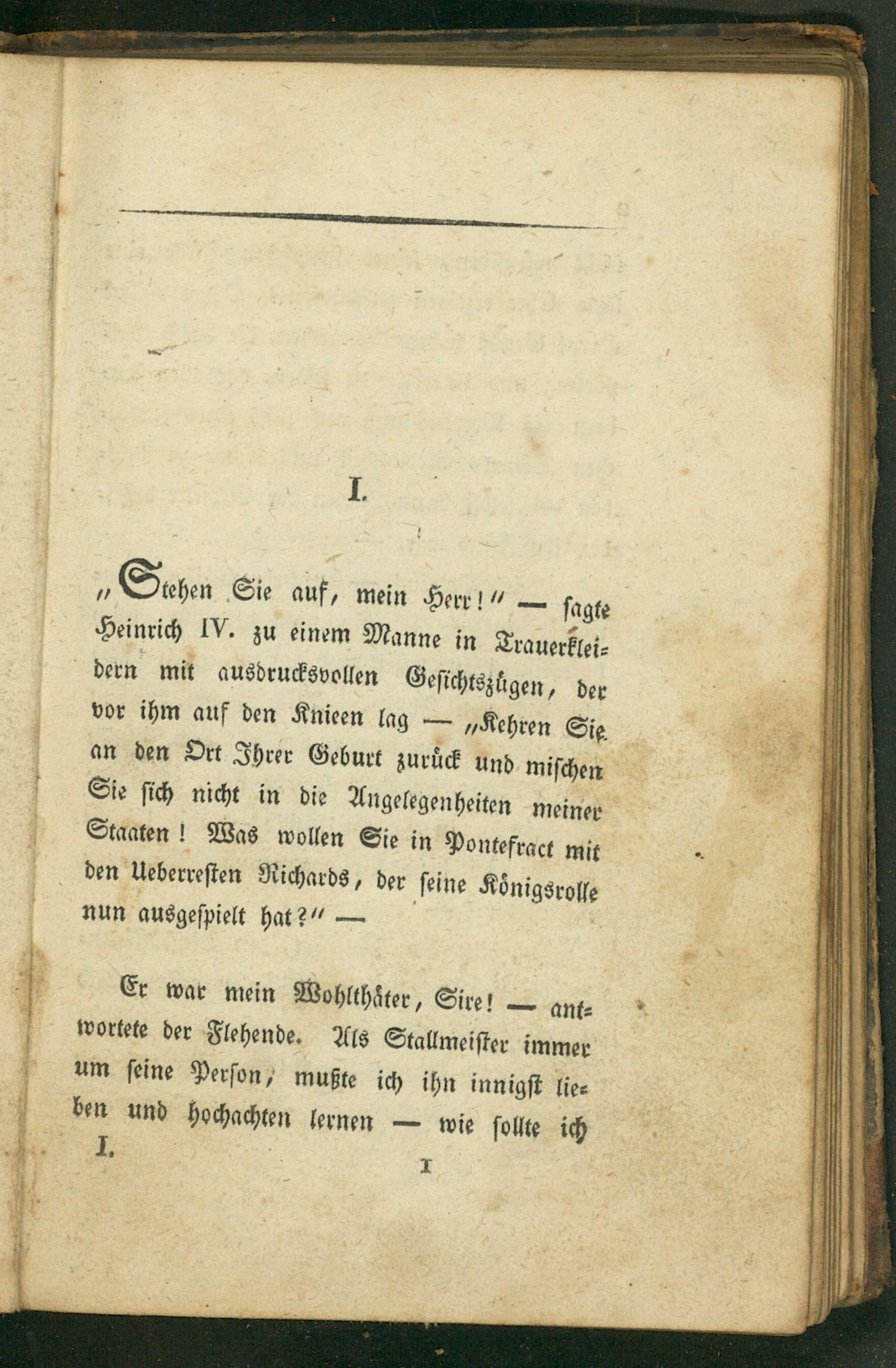 „ Sehen Sie auf, mein Herr!“— ſagte Heinrich IV. zu einem Manne in Trauerklei⸗ dern mit ausdrucksvollen Geſichtszuͤgen, der vor ihm auf den Knieen lag—„Kehren Sie an den Ort Ihrer Geburt zuruͤck und miſchen Sie ſich nicht in die Angelegenheiten meiner Staaten! Was wollen Sie in Pontefract mit